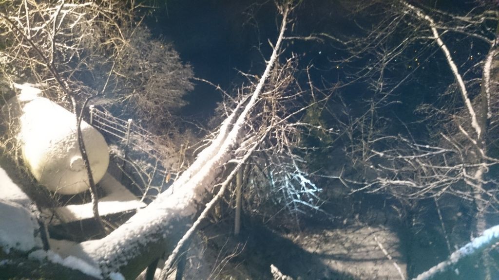 Einen großen Schreck haben am Montagabend die Bewohner eines Hauses in der Straße „Am Steinberg“ in Oberflockenbach bekommen. Gegen 22 Uhr ist aufgrund der großen Schneelast ein Baum in der Nähe des Hauses umgestürzt. Der Baum ist auf eine Freileitung gefallen und hat diese mit so hoher Wucht getroffen sodass ein Freileitungsmast nachgegeben hat. Der Mast ist an das Dach des Anwesens gefallen. Glück im Unglück war, dass ein Flüsssiggastank nur knapp vom Baum verfehlt wurde. Die Feuerwehr Weinheim Abteilung Oberflockenbach wurde aufgrund dieser Meldung zusammen mit der Polizei und den Stadtwerken Weinheim zu dieser Einsatzstelle alarmiert.
