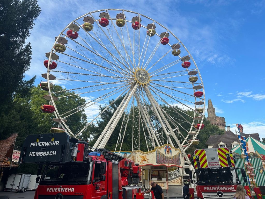 Die Drehleiter der Weinheimer Feuerwehr schafft von einem stabilen Standort aus die oberste Etage des Riesenrades, die Freudenberg-Wehr hat sogar noch Luft nach oben. „Wir gehen zwar nicht von einer solchen Situation aus, aber es ist für alle Beteiligten das Beste und Sicherste, wenn wir die Gegebenheiten vor Ort genau kennen“, fasste Feuerwehrkommandant Ralf Mittelbach zufrieden zusammen. Die Weinheimer Kerwe sei traditionell ein sehr friedliches Fest ohne größere Zwischenfälle – auch weil die Sicherheitskräfte gut vernetzt sind.