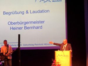 Weinheims Oberbürgermeister Heiner Bernhard ging in seiner Laudatio auch auf die besondere Position Albrechts ein, der als hauptamtlicher Mitarbeiter der Stadt Weinheim eine ehrenamtliche Feuerwehr geführt hat. „Dabei sitzt man oft zwischen den Stühlen, aber wenige Menschen machen in dieser unbequemen Position noch so eine gute Figur wie Reinhold Albrecht“, bescheinigte der OB. Was ihm geholfen habe, so Bernhard, „ist seine unbestrittene fachliche Kompetenz und seine Art, nach rein fachlichen Kriterien abzuwägen und zu entscheiden“. Der Rathauschef und Dienstherr: „Alles andere spielte bei Reinhold Albrecht keine Rolle, und das hat ihn in manch schwieriger Situation letztendlich unanfechtbar gemacht.“