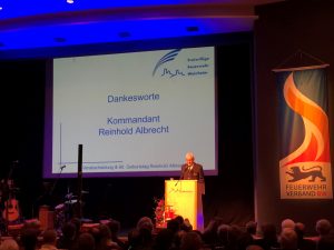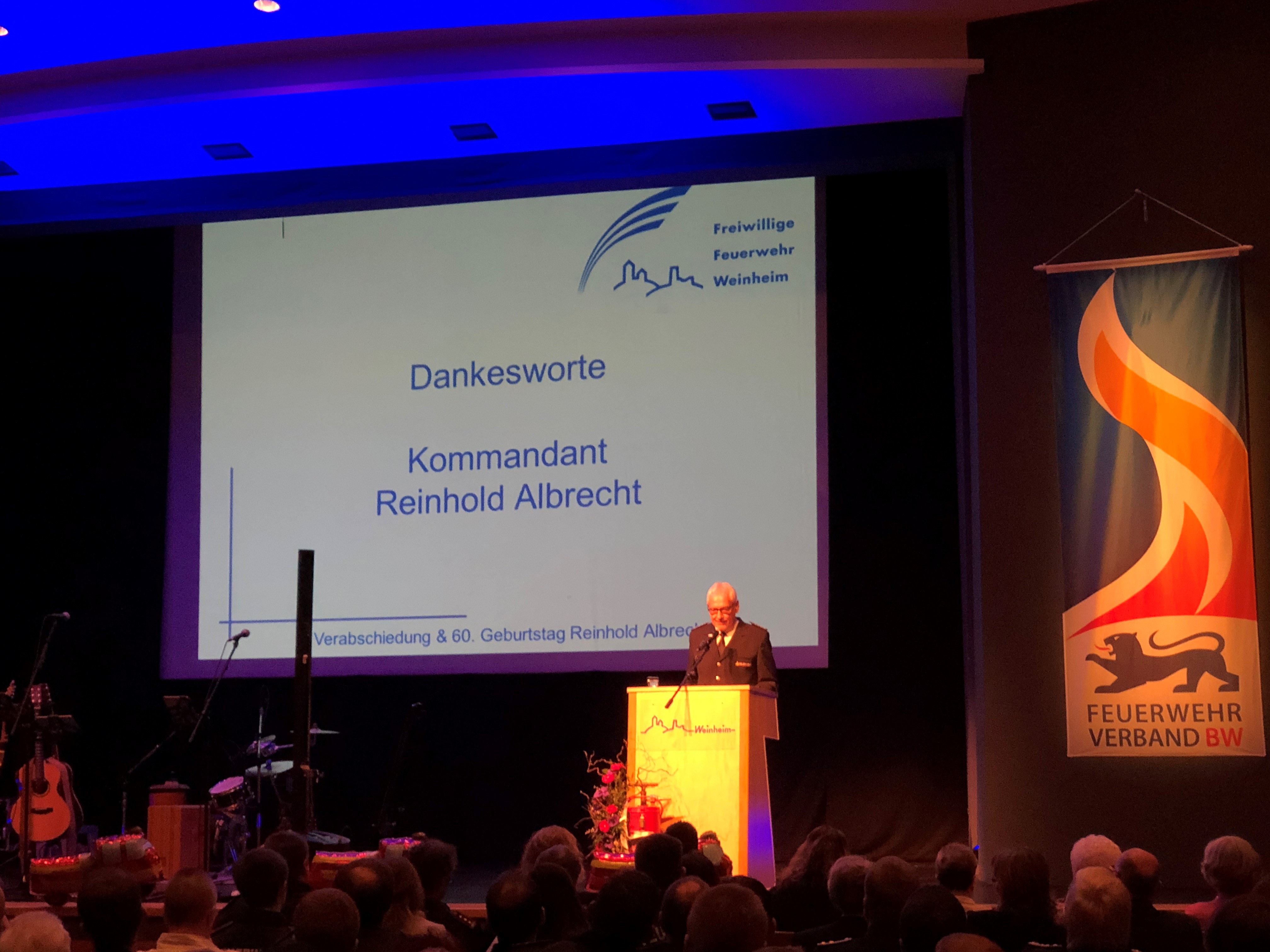 Daher sei es die einzig richtige Entscheidung gewesen, im Jahre 2008 die Kommandantschaft der Freiwilligen Feuerwehr in einer hauptamtlichen Tätigkeit bei der Stadt Weinheim abzusichern. Heiner Bernhard betonte, dass Reinhold Albrecht die Freiwillige Feuerwehr Weinheim in diesen 20 Jahren den rasch wachsenden Erfordernissen angepasst und konsequent weiterentwickelt habe, vor allem durch eine fast permanente Innovationskraft. Unter anderem erinnerte er an den „zukunftsweisenden Umzug ins neue Feuerwehrzentrum, aber auch die Erstellung und Fortschreibung der Feuerwehrbedarfsplanung, die eine zeitgemäße Ausstattung der Wehr gewährleistet“. Auch eine Reihe von Großveranstaltungen in der Stadt – allem voran zwei Stadtjubiläen – wurden von Sicherheitskonzepten aus seiner Feder begleitet. Bernhard: „Reinhold Albrecht hat die Freiwillige Feuerwehr Weinheim in diesen 20 Jahren als Kommandant weitergebracht und hervorragend aufgestellt für die Zukunft.“ Und: „Ich möchte ich Dir, lieber Reinhold, für all das, was Du getan hast, herzlich danken – vor allem im Namen der Bürgerinnen und Bürger dieser Stadt, deren Sicherheit durch Dich und Deine Mannschaft ein enorm hohes Niveau erreicht hat. Die Weinheimer Feuerwehr ist in der Region spitze.“