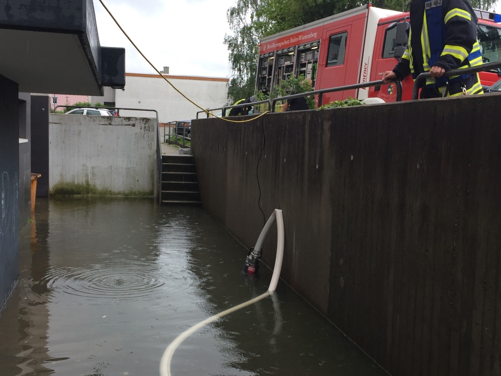 Kurz nach 2 Uhr wurde die Freiwillige Feuerwehr Weinheim Abteilung Stadt zu einem Wasserschaden in den Friedrich Ebert Ring gerufen. Dort war auf circa 100 Quadratmeter Fläche ein Keller Knie hoch unter Wasser gestanden. Als die ersten Kräfte mit Wassersauger und Tauchpumpen anfingen, das Wasser wegzupumpen, wusste noch keiner der ehrenamtlichen Helfer, dass dies der Beginn einer ganzen Einsatzwelle sein wird, die ihren Höhepunkt gegen 6 Uhr am Montagmorgen nahm. Neben der Abteilung Stadt, waren im weiteren Verlauf der Nacht auch die Abteilungen Lützelsachsen-Hohensachsen und Oberflockenbach zu Einsatzstellen ausgerückt. An der Bäckereifachschule verstopfte ein Rechen, was dazu führte, dass das Wasser sich aus dem Bachbett drückte und die Straße sowie Teile des Gebäudes fluteten. Ähnlich sah es auch im Bereich des Waldschimmbad aus. Mit Unterstützung des Baubetriebshof der Stadt Weinheim wurden die Rechen gesäubert, und das Wasser durch die Feuerwehr abgepumpt.