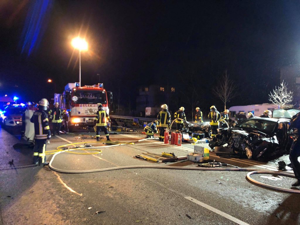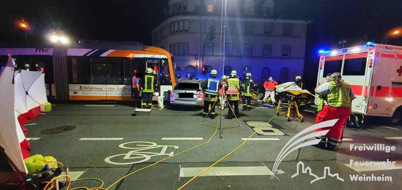 - Die Mannheimer Straße verwandelte sich in Höhe des Weinheimer Krankenhaus zu einem Trümmerfeld, nachdem drei Fahrzeug kollidierten. Die Fahrzeuge wurden durch den Aufprall regelrecht zerrissen und vollständig zerstört. Die Fahrer zweier PKWs waren schwer eingeklemmt und mussten von den Einsatzkräften aus den Fahrzeugwracks mit hydraulischem Rettungsgerät befreit werden. Während der Rettungsarbeiten fing ein Fahrzeug Feuer und konnte rechtzeitig gelöscht werden.