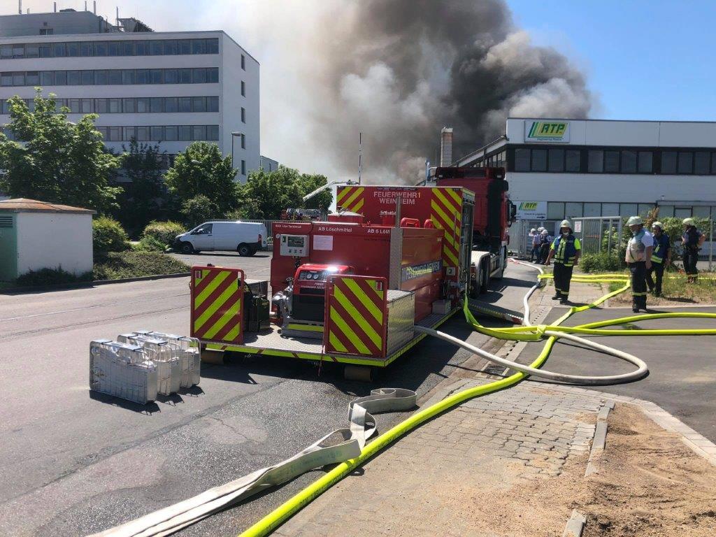 - Mit dem Abrollbehälter Löschmittel und dem Abrollbehälter Atemschutz sowie einem Löschfahrzeug rückte die Abteilung Stadt sowie die Werkfeuerwehr Freudenberg und vielen weiteren Feuerwehren der Region nach Ladenburg ab. Eine weithin sichtbare Rauchsäule ausgelöst durch den Brand einer Lagerhalle wies den Einsatzkräften den Weg. Die Zusammenarbeit der Feuerwehren der Region klappte hervorragend und so konnte auch diese Feuer schnell gelöscht werden.
