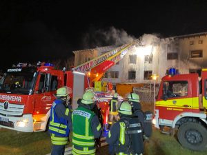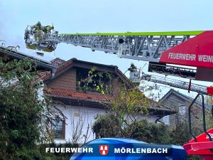 An Ostern brach im Ulmenweg in der Weinheimer Weststadt in einem Zweifamilienhaus in der Nacht ein Brand aus. Nach der Brandentdeckung durch einen Bewohner konnten sich die sechs Bewohner selbstständig in Sicherheit bringen. Bei Eintreffen der ersten Einsatzfahrzeuge der Feuerwehr Weinheim Abteilung Stadt, schlugen bereits Flammen aus dem Dachstuhl und der Dachhaut. Die Drehleiter wurde mit dem Wenderohr in Stellung gebracht, während der erste Angriffstrupp unter Atemschutz zur Brandbekämpfung im Inneren des Gebäudes vor ging. Gleichzeitig wurde im Außenbereich eine Riegelstellung mit einem weiteren C-Rohr aufgebaut, um eine Brandausbreitung auf andere Gebäudeteile zu verhindern. Zur Unterstützung wurden noch die Abteilung Sulzbach mit zwei weiteren Fahrzeugen nachalarmiert, sowie die Feuerwehr Hemsbach mit einer zusätzlichen Drehleiter. Diese wurde ebenfalls in Stellung gebracht und unterstützte mit einem weiteren Rohr die Löscharbeiten in dem mittlerweile offenen Dachstuhl.