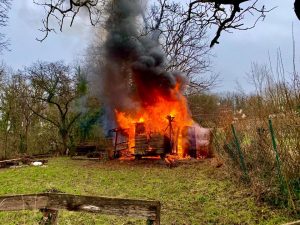 Die Abteilung Lützelsachsen-Hohensachsen löschte im Viehweg ein Gartenhüttenbrand. Beim Eintreffen der Freiwilligen Feuerwehr standen eine Gartenhütte, sowie ein angrenzendes Gewächshaus in Vollbrand. Mehrere Trupps unter Atemschutz gingen direkt zur Brandbekämpfung vor.