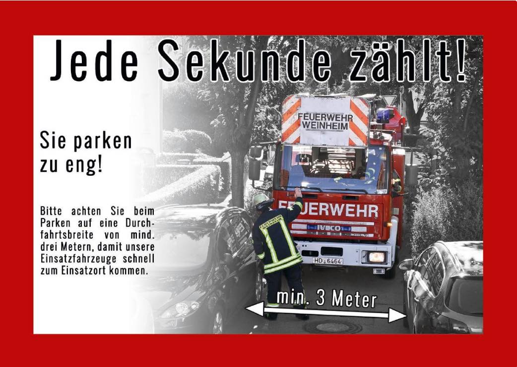 „Bestrafen Sie sich nicht selbst und parken nicht im Haltverbot oder Feuerwehrzufahrten. Denken Sie immer daran, dass Sie der sein könnten, der plötzlich und unerwartet Hilfe braucht.“ so appellierte die Feuerwehr auf Facebook im Februar da sich die Falschparker und dadurch schwierige Verkehrssituationen für die Feuerwehr wieder häuften. Viele Straßen sind für die Fahrer von Rettungswagen und Feuerwehrfahrzeugen eine Herausforderung. Durch das Falschparken werden wir oft aufgehalten und die Hilfsfristen sind kaum einzuhalten.