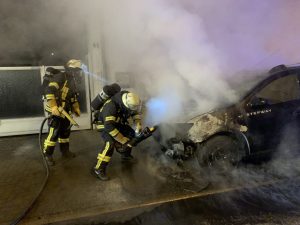 Zum ersten Einsatz im neuen Jahr musste Freiwillige Feuerwehr Weinheim in die Nördliche Hauptstraße ausrücken. Ein Pkw Brand war aus bisher ungeklärter Ursache in Brand geraten. Durch die hohe Hitze und Wärmestrahlung schmolzen bereits die Rollläden des angrenzenden Wohnhauses, so dass die Einsatzkräfte ein Übergreifen des Brandes verhindern mussten. Mit einem Feuerlöscher hatten Passanten bereits erste Löschversuche unternommen, die allerdings durch die schnelle Brandausbreitung nicht mehr zum Erfolg führten. Ein Trupp unter Atemschutz konnte das Feuer und die starke Rauchentwicklung mit einem Rohr unter Kontrolle bringen.