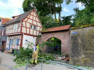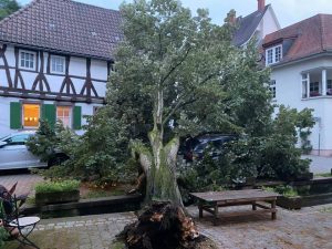 Glück im Unglück hatten die Bewohner der Weinheimer Altstadt. Die große alte Linde die am kleinen Quergassen-Platz (Ecke Lohgasse) stand und immer für Schatten im Sommer sorgte während die Kinder in der Gerberbach badeten, verabschiedete sich mit einem lauten Knackgeräusch und fiel komplett um. Glücklicherweise war zu dem Zeitpunkt niemand, in der sonst sehr belebten Altstadt unterwegs gewesen, so das niemand verletzt wurde. Weniger Glück hatten zwei PKWs, sowie das Gebäude der angrenzende ehemaligen Bäckerei Wendel. Darauf krachte der Baum und beschädigte die beiden Fahrzeuge, sowie das Haus. Die Einsatzkräfte sicherten gemeinsam mit dem Baubetriebshof der Stadt Weinheim die Unfallstelle ab und sorgten mit der Kettensäge dafür, dass die Bewohner in ihr Haus wieder reinkamen.