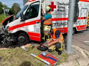 Zu einem schweren Verkehrsunfall im Kreuzungsbereich B38/Westtangente musste die Abteilung Stadt ausrücken. Die Fahrerin eines Rettungswagens war mit Blaulicht und Martinshorn die Kreuzung an einer roten Ampel am Überqueren, als ein Audi Fahrer auf der B38 von der Autobahn kommend an einer grünen Ampel nach links in Richtung Saukopftunnel fahren wollte. Hierbei kam es zum Zusammenstoß, wodurch die Fahrerin des Rettungswagens schwer, sowie drei weitere Unfallbeteiligte leicht verletzt wurden. Die Feuerwehr sicherte die Einsatzstelle, stellte den Brandschutz sicher und kümmerte sich um die auslaufenden Betriebsstoffe. Leider kam es auch bei diesem Einsatz wieder vor, dass die Absperrung umfahren wurde und zwei LKWs nur durch einschreiten der Polizei an der Einfahrt in die Unfallstelle gehindert wurden.