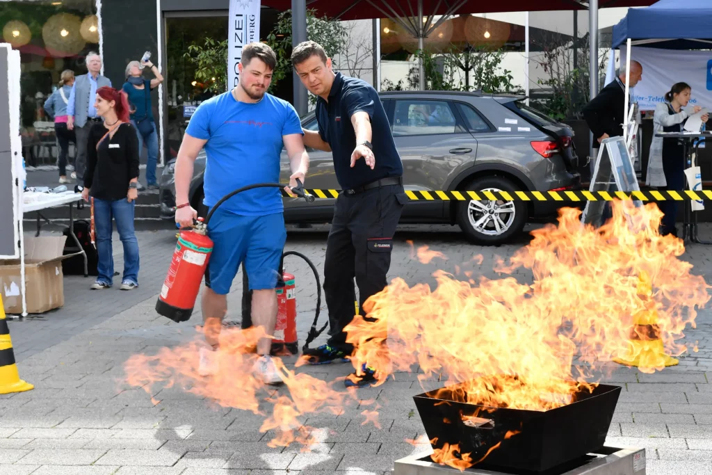 Auf dem Dürreplatz hat die Stadt Weinheim ein vielfältiges Mitmach- und Informationsprogramm zum Thema Zivilcourage organisiert. Mit dabei sind der Weiße Ring, das Deutsche Rote Kreuz, die Feuerwehr Weinheim und der Stadtjugendring. Erst die gelbe Lasche entfernen, dann den roten Knopf fest herunterdrücken. Anschließend den Feuerlöscher in die Hand nehmen und auf das Ziel richten. Florian Wagner von der Feuerwehr Weinheim entfacht das Feuer – jetzt heißt es: Wasser Marsch!