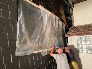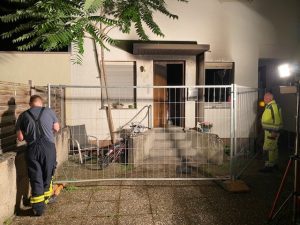 Während die Feuerwehr ihren Einsatz und ihre Gerätschaften um das Brandobjekt weiter aufbauten, wurde die Drehleiter in Stellung gebrachte. Die Einsatzleitung ließ die Einsatzstelle großflächig ausleuchteten, um ein sicheres Arbeiten zu gewährleisten und legte einen Bereitstellungsraum für nachrückende Feuerwehr- und Rettungsdienstkräfte an der Markus Kirche fest. Parallel dazu kämpften der Angriffstrupp in der Brandwohnung gegen die Flammen. Der Brand war sehr ausgedehnt und die Temperaturen so heiß, dass die Einsatzkräfte es zunächst sehr schwer hatten den Brand unter Kontrolle zu bringen. Zur besseren Sicht für den eingesetzten Trupp wurde mit einem Lüfter der dicke schwarze Brandrauch aus dem Gebäude gedrückt. Auf der Rückseite des Gebäudes bauten weitere Feuerwehrangehörige eine sogenannte Riegelstellung auf, um mit einem weiteren Löschangriff das Nachbargebäude zu schützen und die Brandausbreitung auf die darüberliegende Wohnung und das Dach zu verhindern. Das Feuer hatte sich bereits an der Fassade hineingefressen und auch die Fenster der Wohnung im 1. OG zum Platzen gebracht. Durch den gezielten Löschangriff konnte aber auch hier der Brand unter Kontrolle gebracht werden. Gegen Mitternacht hatte die Feuerwehr den Brand im Griff und konnte sich auf die umfangreichen Nachlöscharbeiten konzentrieren.