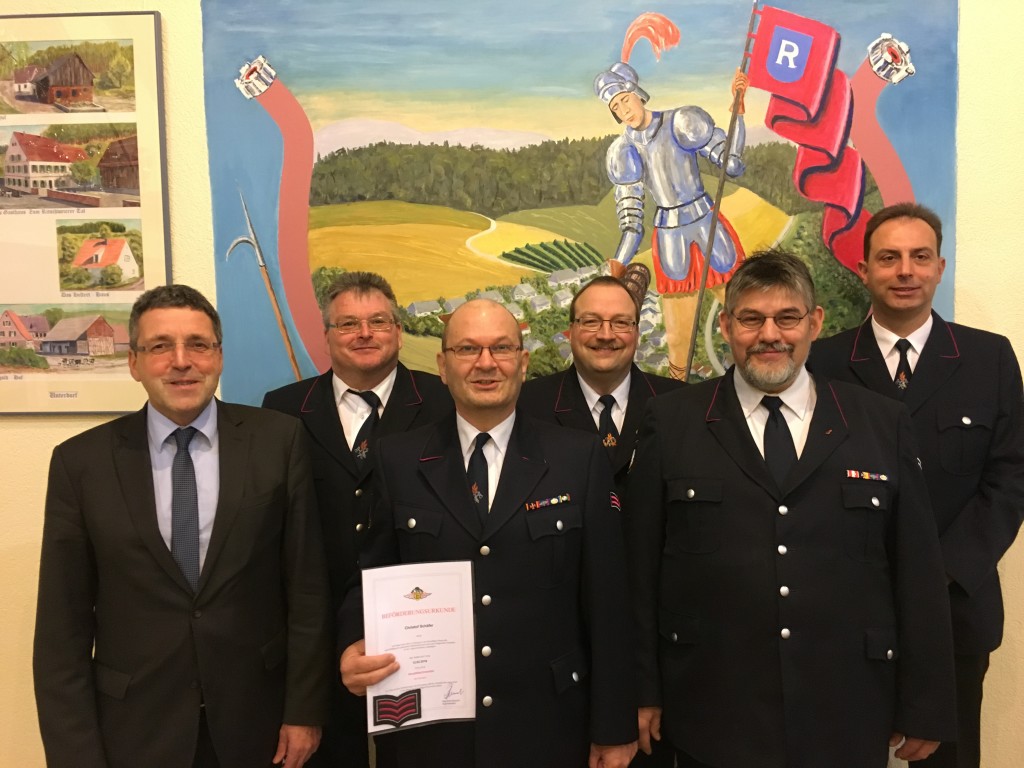 Ralph Seiberling dankte dem Förderverein auch für eine großzügige Spende eines Werkzeugwagens. Mit diesem Wagen kann nun vor allem Feuerwehrgerätewart Markus Scholl besser seinen Aufgaben und Arbeiten nachkommen. Mit Christof Schäfer, der gemeinsam mit dem Kommando der Abteilung Ritschweier das Taktiktraining der Gruppen und Zugführer innerhalb des Ausrückebreich 5 (Abteilungen Oberflockenbach, Rippenweier, Ritschweier) unterstützt, konnte ein bewährter Feuerwehrmann befördert werden. Die Stellvertretenden Stadtbrandmeister Volker Jäger und Andreas Schmitt beförderten Schäfer zum Hauptlöschmeister. Bei den anschließenden Wahlen zum Feuerwehrauschuss aller Weinheimer