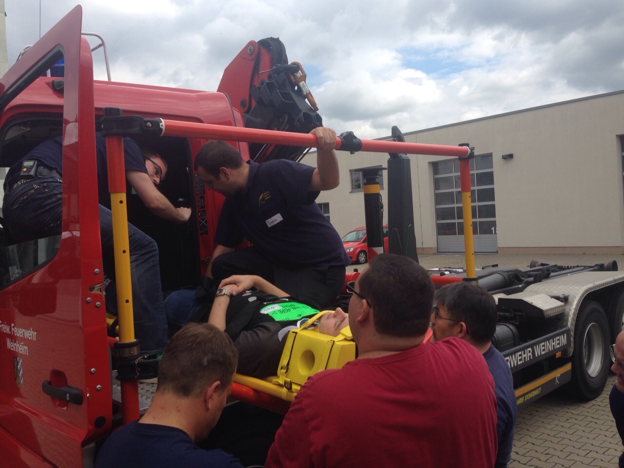 Nach einer theoretischen EinführuDSC_0233ng wurden Fallbeispiele von den Feuerwehrsanitätern in Teams abgearbeitet. Hier galt es zum Beispiel eine Person nach einem Treppensturz oder Verkehrsunfall zu versorgen. Auch die Rettung aus einem LKW mithilfe einer Rettungsplattform wurde geübt. Am Ende der Veranstaltung war man sich einig, dass man durch strukturiertes Vorgehen nach dem ABCDE-Schema sehr schnell alle wichtigen Parameter bei einem Notfall erfassen und Maßnahmen ergreifen kann.