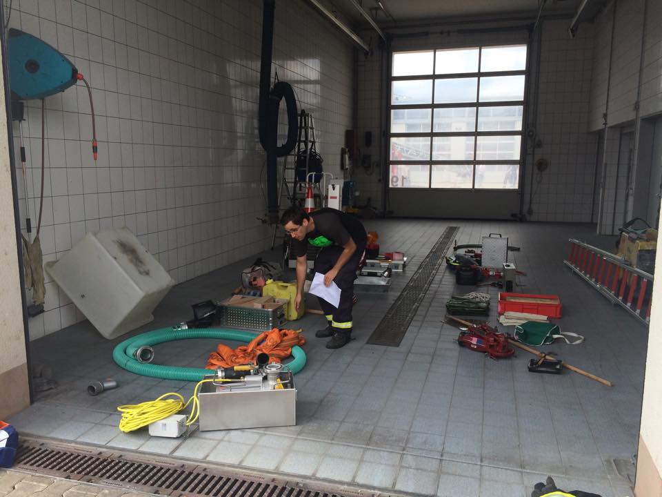 Die letzte Station des Zirkeltrainings wurde im Wettkampmodus durchgeführt. Die Einsatzkräfte mussten aus den Löschfahrzeugen HLF und LF 16/12 CAFS eine gewisse Anzahl an Gegenstände in schnellstmöglicher Zahl raus räumen. Hierbei wurden auch einige nicht alltägliche, im Einsatzgebrauch benötigte Gegenstände, wie zum Beispiel das Bergetuch, oder die längst in die Jahre gekommene Meldertasche gesucht. Die schnellste Gruppe schaffte alle Gegenstände in 13 Minuten zu finden und bereit zu legen, während die längste 23 Minuten brauchte. Hierbei zeigte sich aber auch wie wichtig es ist, sich auf den Fahrzeugen auszukennen, bei über 20. Fahrzeugen in der Abteilung Stadt ist dies natürlich sehr schwer, deswegen werden bei regelmäßigen Übungen mit den Fahrzeugen das Wissen aufgefrischt und erweitert.