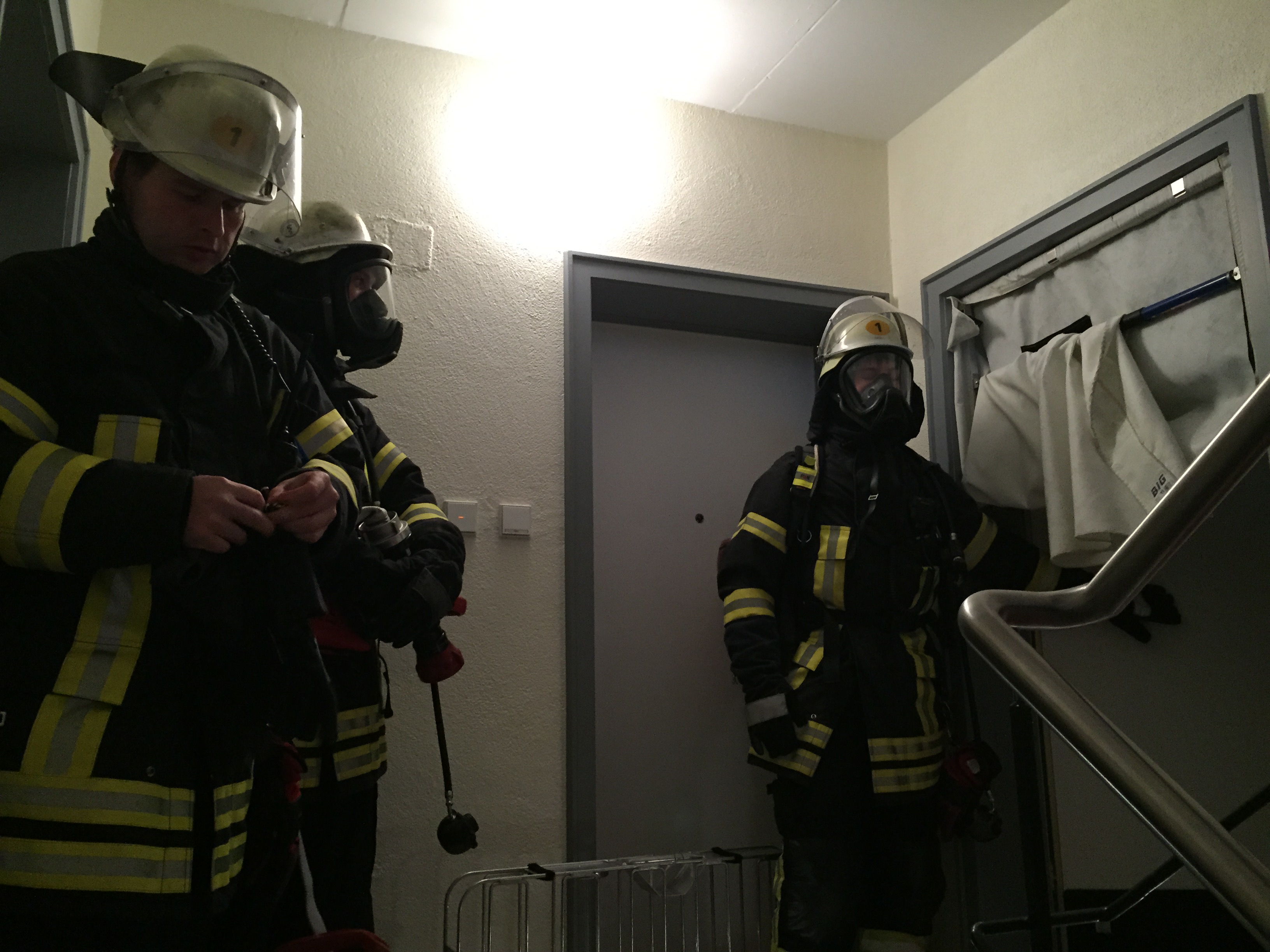Der Löschzug der Abteilung Stadt fuhr umgehend die Einsatzstelle an. Laut der ersten Meldung wurde eine Person noch vermisst. Der erste Trupp unter schwerem Atemschutz schlug die Wohnungstür ein und suchten in der verrauchten Wohnung nach der vermisste Person. Im Wohnzimmer konnte diese gefunden werden. Der Mieter wurde mit einer Rauchgasvergiftung an den Rettungsdienst übergeben und von diesem versorgt. Das Angebrannte Essen, was die starke Verrauchung verursachte hatte, wurde vom Herd genommen und abgelöscht. Gleichzeitig wurde zur Sicherheit der Bewohner das Gebäude geräumt. Die Wohnung wurde anschließend Mithilfe eines Lüfters entraucht und belüftet.