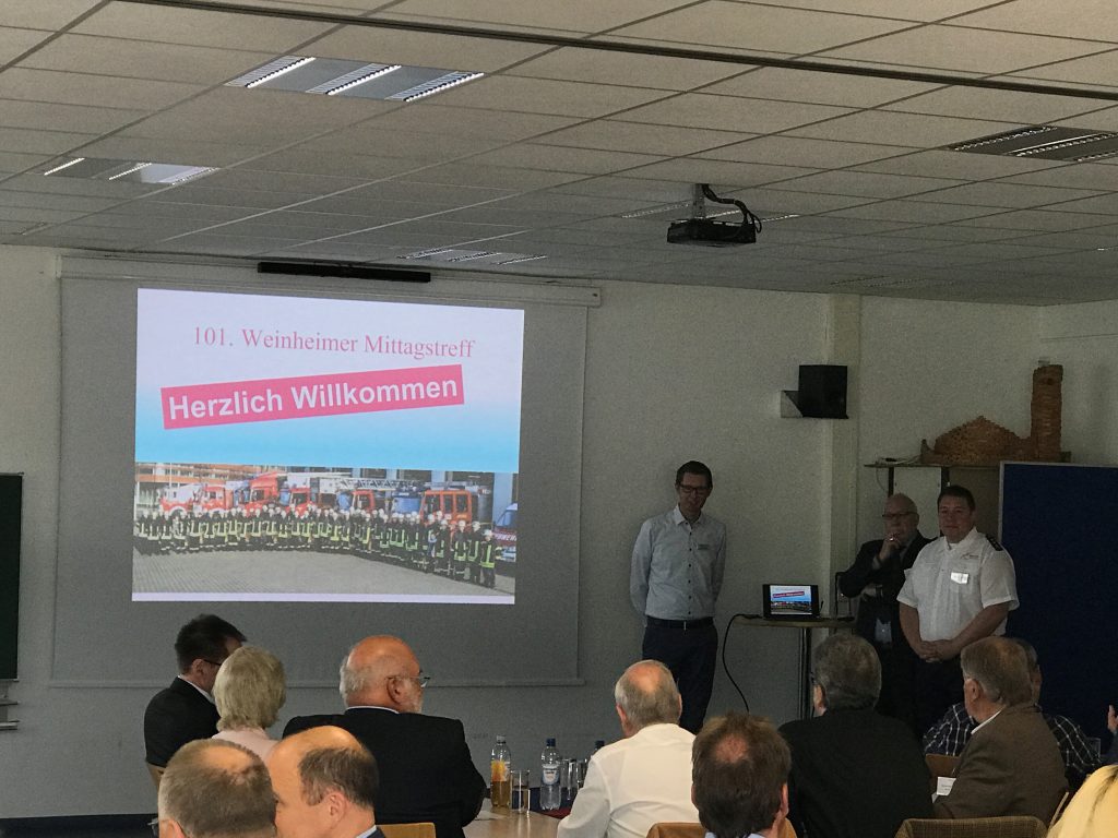 Flammen fackeln nicht lange. Sie fragen nicht, woher sie ihre Nahrung bekommen. Wohn- und Gewerbeimmobilien sind beide brandgefährlich, wenn ein Feuer ausbricht. Aber es gibt moderne Mittel, das Risiko deutlich zu vermindern. Und in Weinheim nicht zuletzt gibt es eine engagierte und hochmotivierte Freiwillige Feuerwehr. Das erfuhren jetzt auch die Vertreter der Weinheimer Wirtschaft beim kürzlichen Mittagstisch der Weinheimer Wirtschaftsförderung. Dieses Netzwerk, das sich zum 101. Mal traf, war zu Gast bei der Freiwilligen Feuerwehr im Feuerwehrzentrum in der Bensheimer Straße. Das Interesse war groß, was Weinheims Stadtkommandant Ralf Mittelbach mit Freude zur Kenntnis nahm. Die große Resonanz wertete Mittelbach als Wertschätzung gegenüber der Wehr und ihrem großen ehrenamtlichen Einsatz. Er berichtete den staunenden Gewerbetreibenden – überwiegend aus dem mittelständischen Gewerbe – von einer Rekordzahl an Einsätzen im vergangenen Jahr: 1133 Mal musste die Wehr in 2016 in den Einsatz.