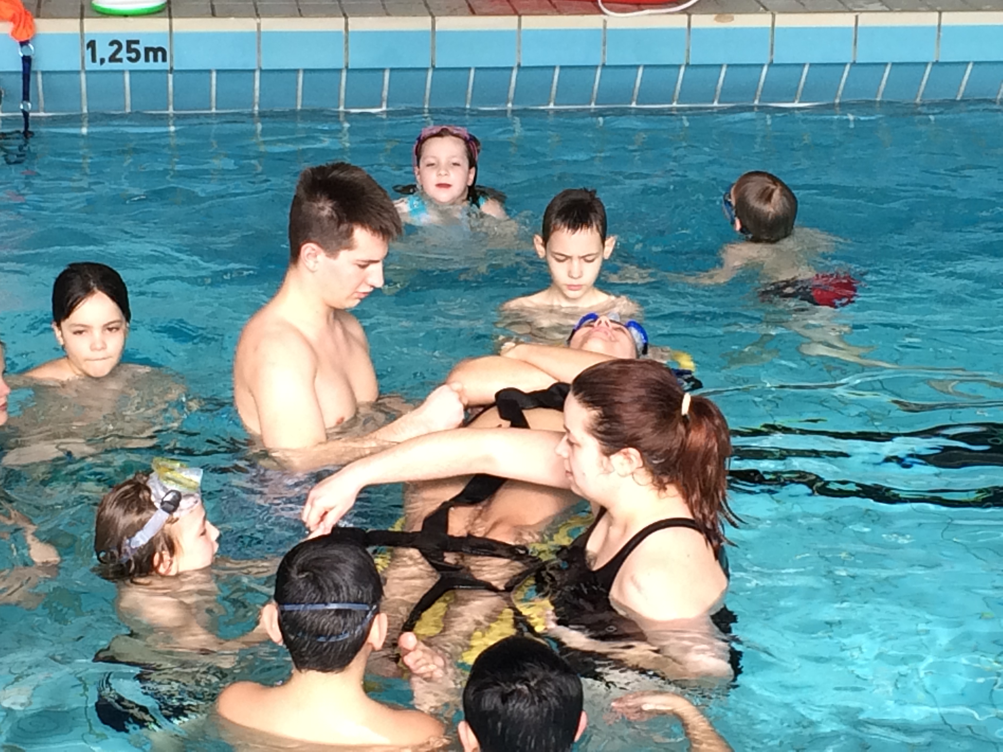 Gemeinsam mit der Deutsche Lebens-Rettungs-Gesellschaft (DLRG) Ortsverein Weinheim wurde den Kindern und Jugendlichen der sichere Umgang im Wasser näher gebracht. Neben dem obligatorischen „nach Ringen tauchen“ stand auch die Handhabung des Spineboards und die Rettung von Personen aus dem Wasser auf dem Programm. ist ein Hilfsmittel zur Rettung verunfallter Personen, bei denen eine Verletzung der Wirbelsäule nicht auszuschließen ist. Das Spineboard besteht entweder aus Holz oder auch aus Hartplastik, das je nach Hersteller bis zu 1.100 kg Tragfähigkeit besitzt ohne sich zu verformen. Wegen seiner Schwimmfähigkeit wird es auch in der Wasserrettung eingesetzt.Mareike Münch vom Schwimmen_StadtDLRG und ihr Team zeigte den Teilnehmern die richtige Handhabung der Geräte, wir bedanken uns nochmal für die gute Zusammenarbeit mit dem DLRG am diesem Schwimmnachmittag. Die Kinder durften das Spineboard ausprobieren und konnten sich mit der Wasserrettungsboje Personen durch das Wasser ziehen, was für leuchtende Augen bei den Kleinen und Großen sorgte und jeder sich wie in der Serie „Baywatch“ fühlen durfte. Natürlich kam auch der Badespaß nicht zu kurz und so wurde kurzerhand das Hallenbad in ein Wasserballfeld und einer Liegeoase umgewandelt.
