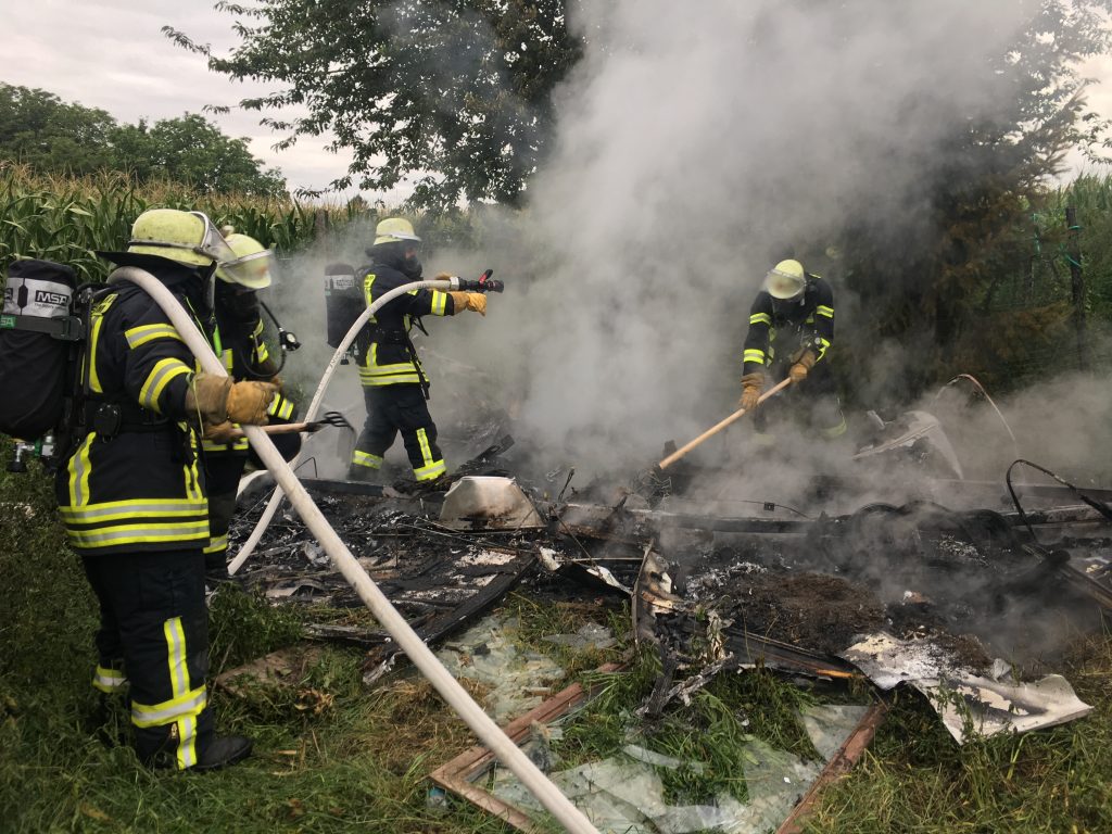 Weinheim. Im Gewann Hammelsbrunnen hinter der GRN-Klink Rhein-Neckar wurde der Freiwilligen Feuerwehr Weinheim Abteilung Stadt, am Samstagabend gegen 17:40 Uhr eine große schwarze Rauchsäule gemeldet. Vor Ort stellte sich heraus, dass auf einem Gartengrundstück im Feld, ein privat genutzter Wohnwagen in voller Ausdehnung brannte. Mit zwei Löschfahrzeugen wurde die Brandbekämpfung eingeleitet. 200 Meter Schlauchmaterial mussten die Einsatzkräfte in das schlecht zugänglichen Gelände legen, um das Löschwasser an den Brandherd zu bringen. Das Feuer war bereits so weit vorangeschritten, dass die Feuerwehr den Wohnwagen nicht mehr retten konnte. Er brannte vollständig aus. Mit zwei Strahlrohren gelang es aber, die Flammen einzudämmen und ein Übergreifen auf die Nachbargrundstücke zu verhindern. Nach einer halben Stunde war das Feuer gelöscht. Mit der Wärmebildkamera wurde eine abschließende Brandnachschau gehalten und die Einsatzstelle der Polizei Weinheim für die Brandursachenermittlung übergeben.