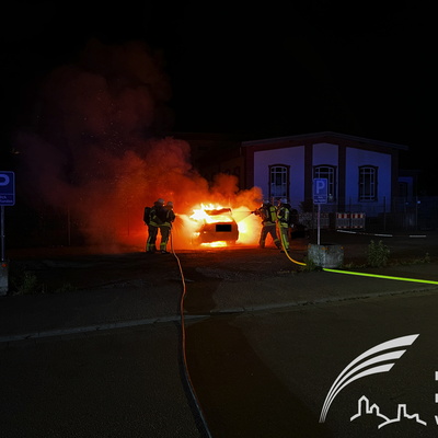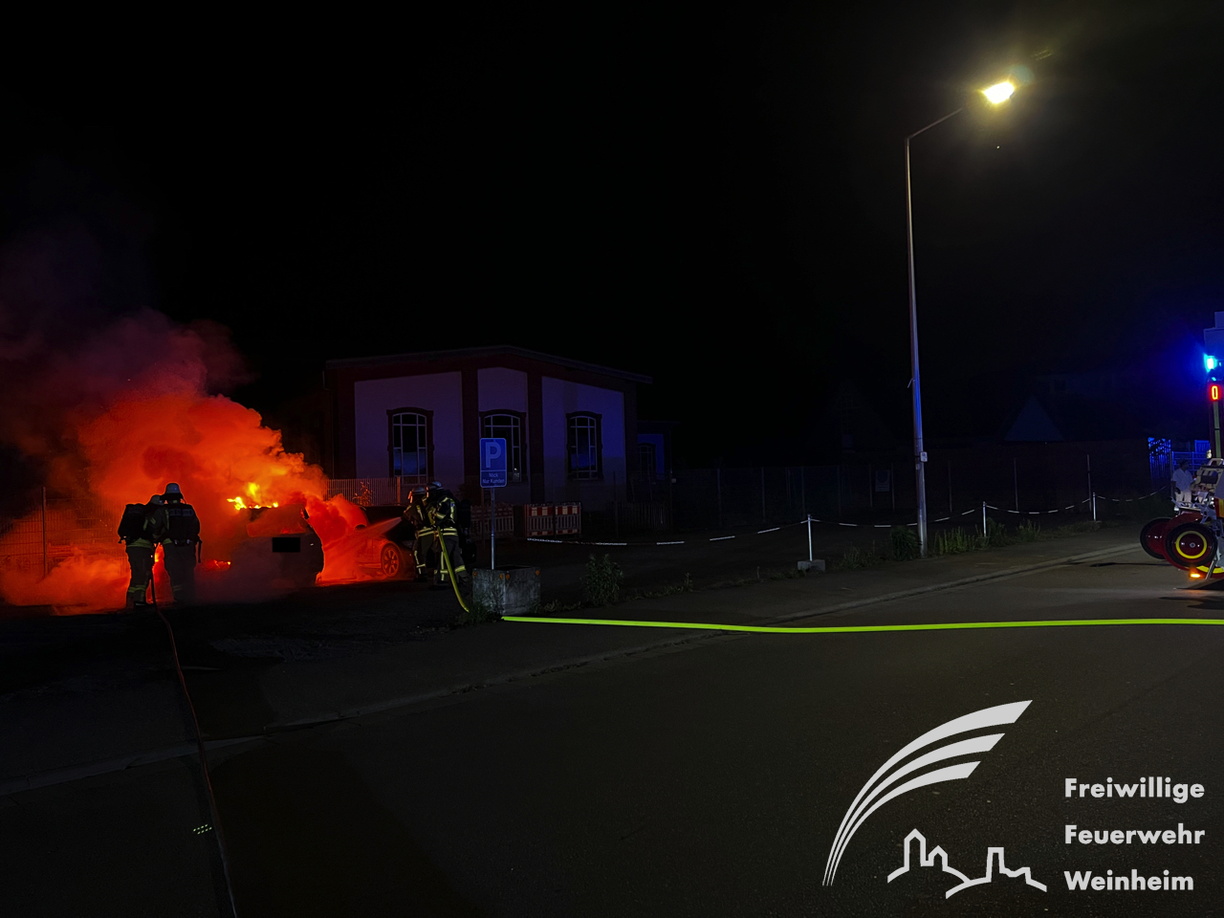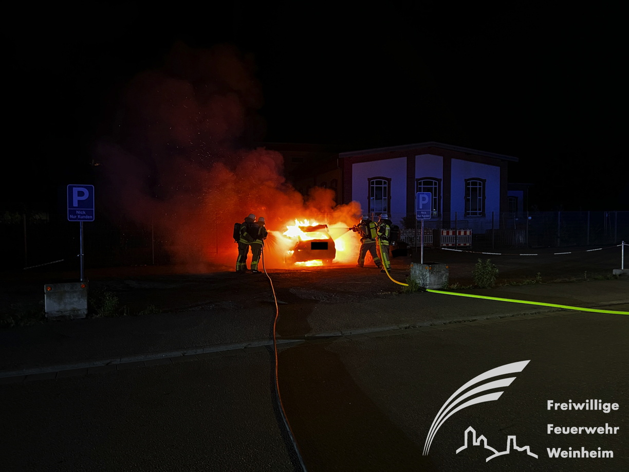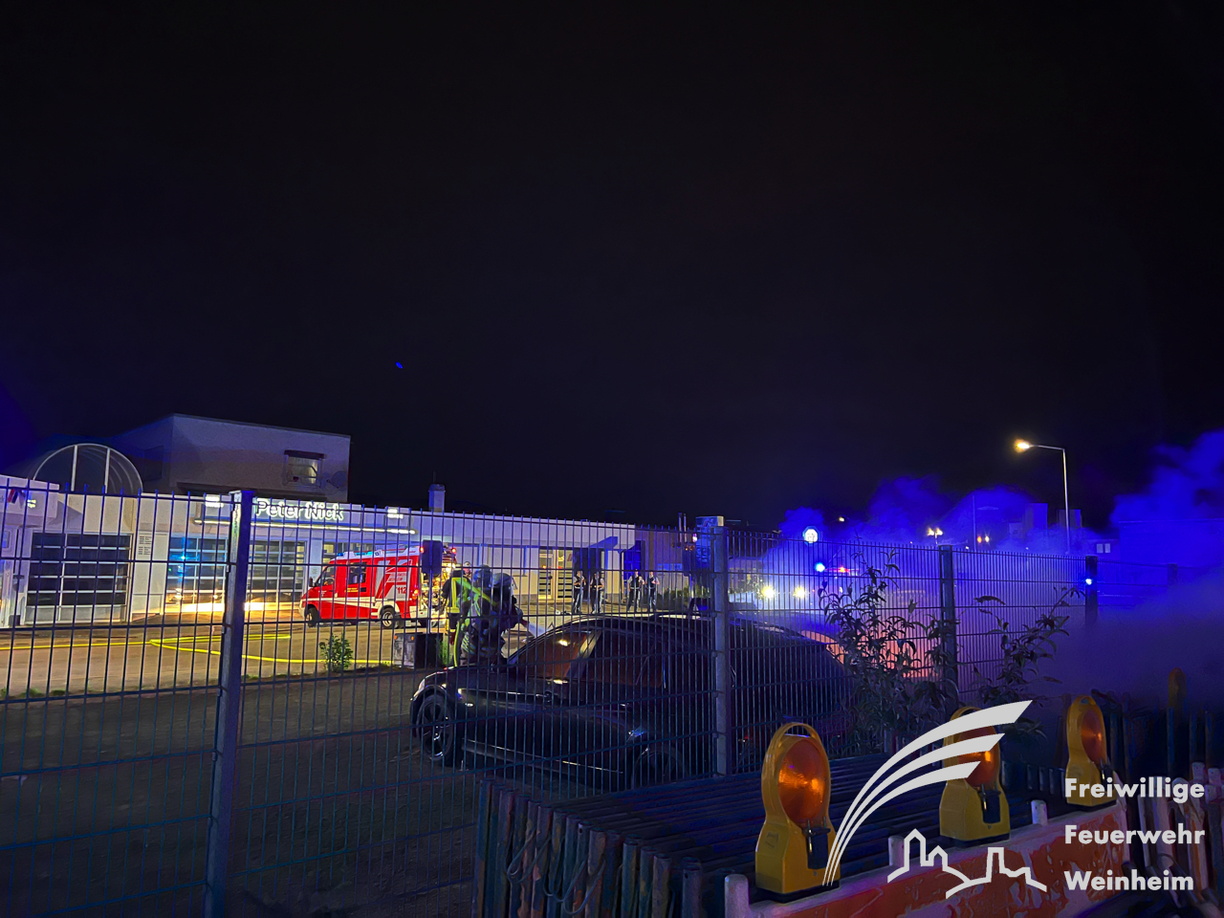 Weinheim. Kurz nach 23 Uhr wurde die Freiwillige Feuerwehr Weinheim Abteilung Stadt zu einem Pkw Brand auf dem Freigelände eines Autohauses gerufen. Parallel zur Weinheimer Feuerwehr rückte auch die Werkfeuerwehr zur Unterstützung bei der Brandbekämpfung an. Zwei Trupps der Feuerwehren rüsteten sich mit Atemschutzgeräten aus, um sich vor dem Brandrauch zu schützen und die Löschmaßnahmen einzuleiten. Die Polizei sicherte den Verkehr an der Einsatzstelle, während die Feu
