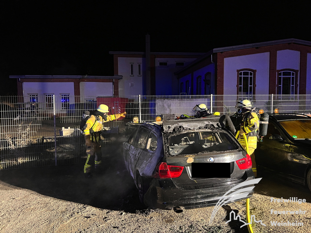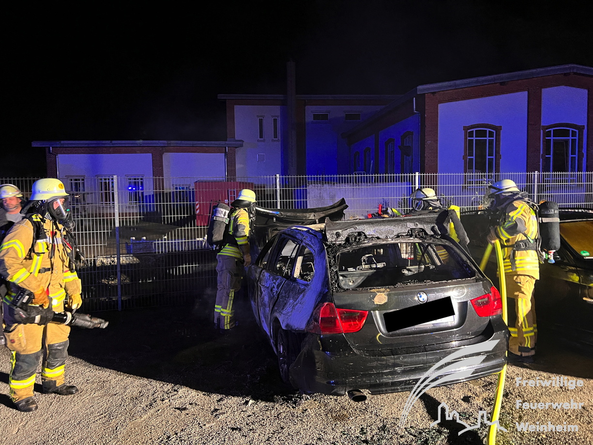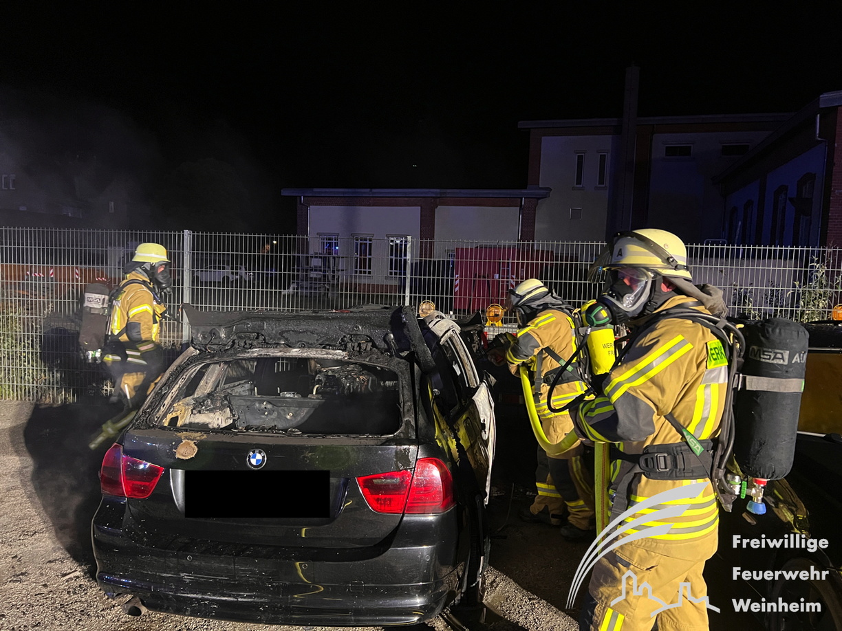 erwehr gegen die Ausbreitung des Brandes kämpfte. Trotz des schnellen Löscherfolgs brannte der BMW völlig aus und ein zweites Fahrzeug wurde durch die Wärmestrahlung stark beschädigt. Auch Materialien des angrenzenden Bauhofs wurden beschädigt. Nachdem das Feuer gelöscht war, wurden keiner Nachlöscharbeiten mit Unterstützung einer Wärmebildkamera durchgeführt, um letzte Glutnester zu finden. Der Rettungsdienst war ebenfalls zur Absicherung vor Ort. Verletzt wurde aber glücklicherweise niemand. Wie es zu dem Feuer kam, ist unklar und Gegenstand der Brandursachenermittlung, die das Polizeirevier Weinheim übernommen hat