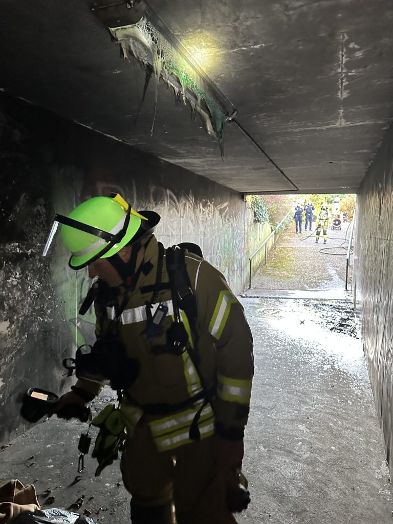 Weinheim. Schwarzer Brandrauch quoll am Montagabend aus der Unterführung Rote Turmstraße zwischen Luppert Bauten und Schlosspark. Augenzeugen meldeten die starke Rauchentwicklung über den Notruf 112. Mit drei Löschfahrzeugen rückte die Freiwillige Feuerwehr Weinheim Abteilung Stadt an. Bei Ankunft der Freiwilligen Feuerwehr meldeten Passanten, dass sich in der Unterführung eventuell noch eine Person befinden könnte, die sich dort öfter aufhält. Daher ging der erste Angriffstrupp unter Atemschutz zur Brandbekämpfung und Menschenrettung vor. Das Feuer konnte schnell von den Einsatzkräften unter Atemschutz lokalisiert werden.