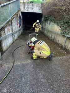 Während die Löschwasserversorgung sichergestellt wurde, ging ein weiter Trupp unter Atemschutz in Bereitstellung. Es stellte sich heraus, das Sperrmüll und Unrat aus bisher unbekannter Ursache in Brand geraten waren. Mit einem Rohr konnte der Kleinbrand schnell gelöscht werden. Der Brandrauch wurde mit einem Hochdrucklüfter aus der Unterführung gedrückt. Die vermisste Person war während des Brandes nicht in der Unterführung, so dass keine Person gerettet werden musste. Da in der Unterführung auch die Beleuchtung durch die Wärmestrahlung beschädigt wurde, wurden auch die Stadtwerke Weinheim von der Feuerwehr zur Unterstützung nachgefordert, um eine weitere Gefahr durch den Strom auszuschließen. Nach einer halben Stunde war der Einsatz so weit abgearbeitet. Die aufgebauten Schlauchleitungen wurden zurückgebaut und die Einsatzstelle dem Baubetriebshof der Stadt Weinheim übergeben. Sachdienliche Hinweise zur Brandursache nimmt das Polizeirevier Weinheim unter 06201/10030 entgegen.