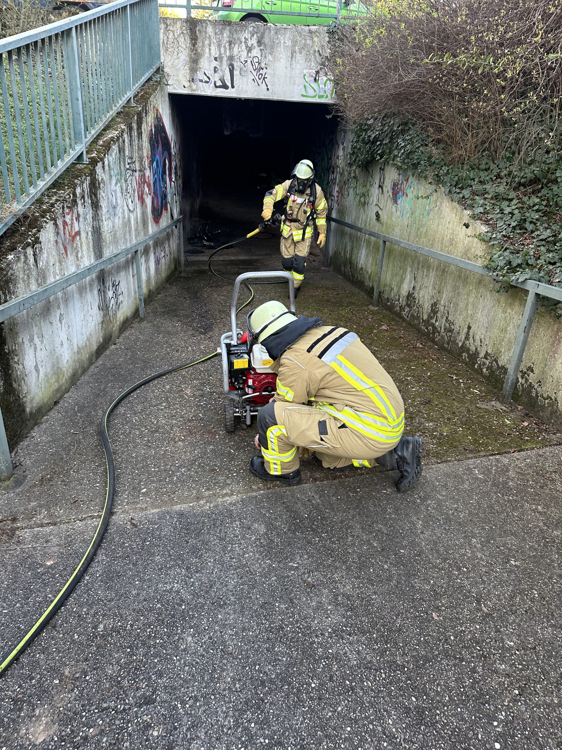 Weinheim. Schwarzer Brandrauch quoll am Montagabend aus der Unterführung Rote Turmstraße zwischen Luppert Bauten und Schlosspark. Augenzeugen meldeten die starke Rauchentwicklung über den Notruf 112. Mit drei Löschfahrzeugen rückte die Freiwillige Feuerwehr Weinheim Abteilung Stadt an. Bei Ankunft der Freiwilligen Feuerwehr meldeten Passanten, dass sich in der Unterführung eventuell noch eine Person befinden könnte, die sich dort öfter aufhält. Daher ging der erste Angriffstrupp unter Atemschutz zur Brandbekämpfung und Menschenrettung vor. Das Feuer konnte schnell von den Einsatzkräften unter Atemschutz lokalisiert werden.