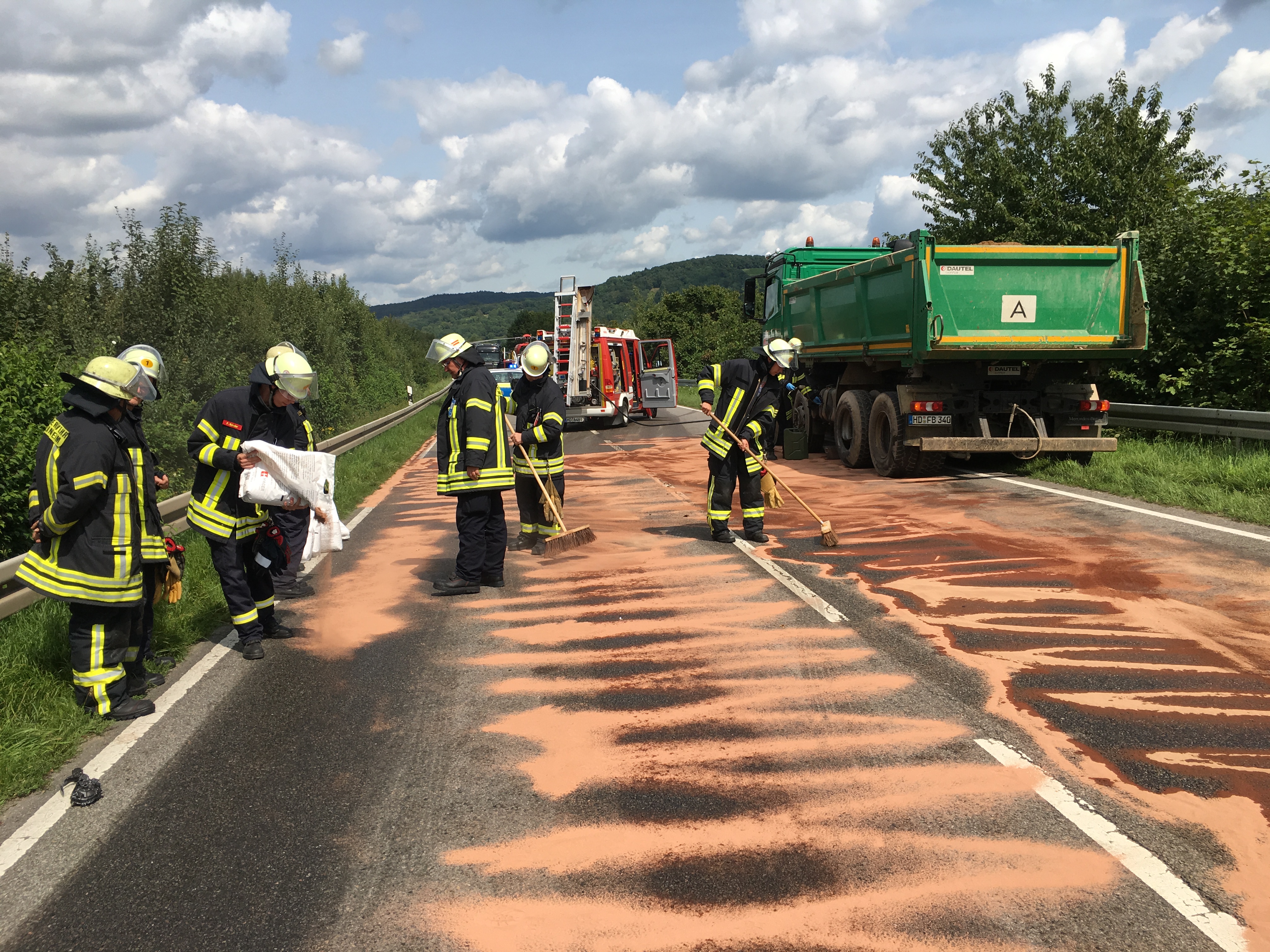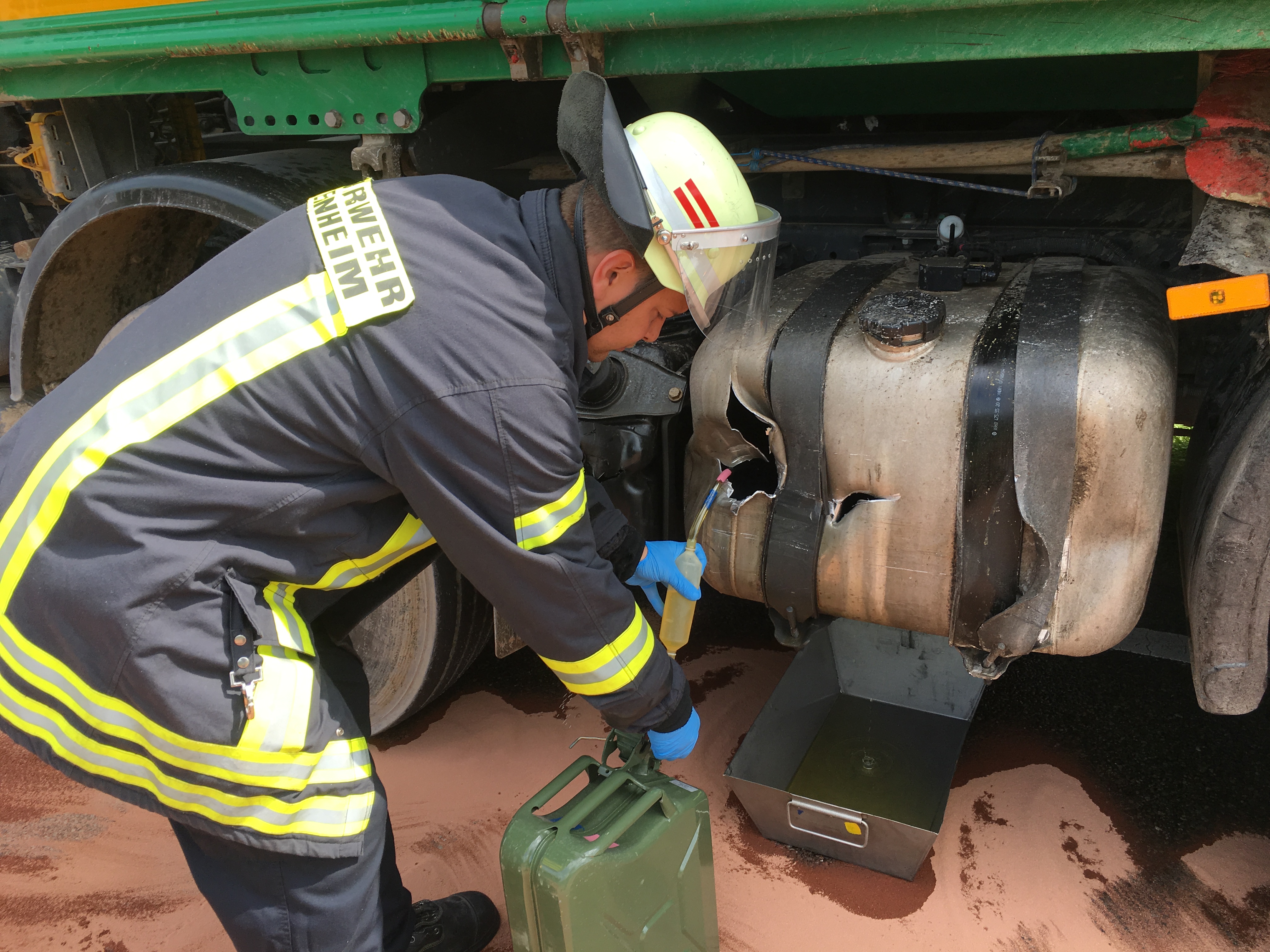 Der Diesel wurde mit Bindemittel gebunden und eine weitere Ausbreitung verhindert. Da der Kraftstofftank des LKW zerrissen war, musste der restliche Inhalt durch die Feuerwehr abgepumpt werden. Auch an dem PKW wurde die auslaufenden Betriebsstoffe aufgenommen. Nachdem eine weitere Ausbreitung und Gefahr ausgeschlossen werden konnte, wurde die Einsatzstelle an die Abschleppunternehmen übergeben. Die professionelle Fahrbahnreinigung übernahm eine Fachfirma. Nach eineinhalb Stunden konnte die Feuerwehr den Einsatz abschließen. Durch den Verkehrsunfall kam es bis in die späten Abendstunden im gesamten Weinheimer Stadtgebiet zu Verkehrsbehinderungen, die den Verkehr teilweise fast bis zum Erliegen brachten.