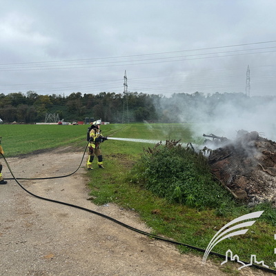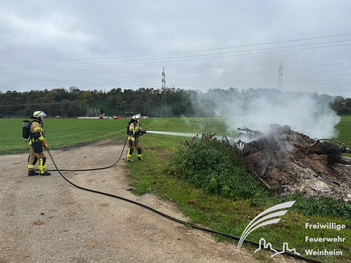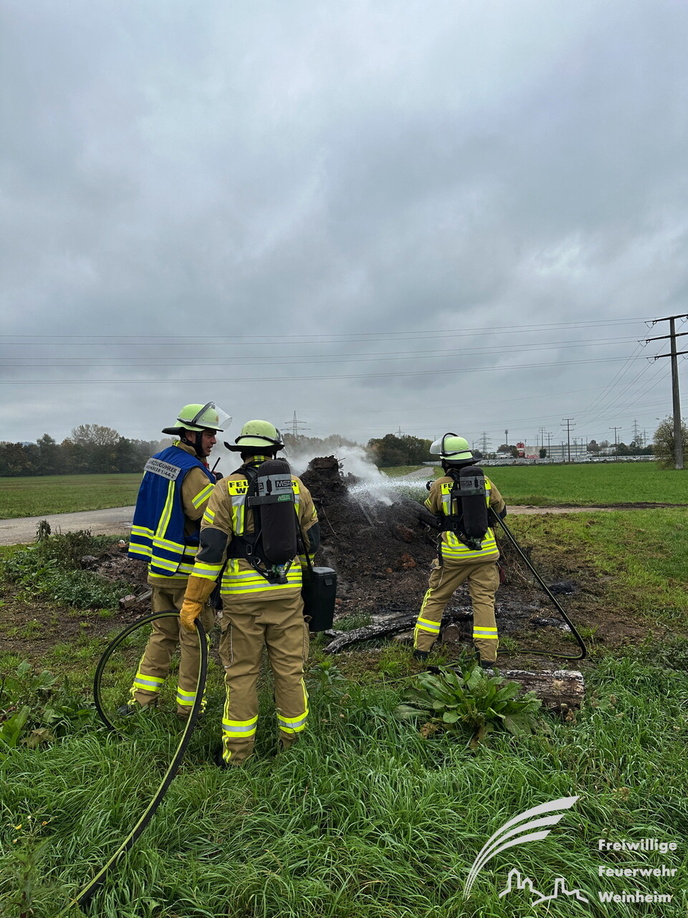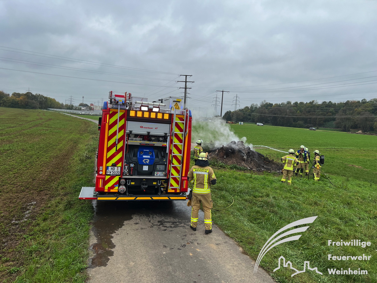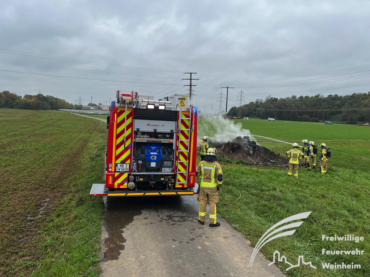 Am Donnerstagmittag wurde die Weinheimer Feuerwehr zur Bertleinsbrücke alarmiert, nachdem im Feld unbeaufsichtigt Unrath brannte. Vor Ort konnten die Einsatzkräfte die Feuerstelle schnell finden, auf der neben Gehölz Matratzen, Müll und Bretter verbrannt wurden. Die Einsatzkräfte bauten einen Löschangriff auf. Eine Baufirma unterstützte die Löschmaßnahmen mit einem Bagger, so dass das Brandgut auseinandergezogen werden konnte. Nach einer Stunde war das Feuer gelöscht und der Einsatz konnte beendet werden. Das Ordnungsamt der Stadt Weinheim hat die Ermittlungen zur Brandursache und illegalen Müllentsorgung aufgenommen.