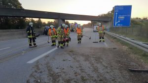 Kurz zuvor war die Feuerwehr bereits auf der BAB 659 im Einsatz. Ein Audi Fahrer verlor kurz vor der Anschlussstelle Viernheim Ost die Kontrolle über sein Fahrzeug, kam ins Schleudern und kollidierte mit der Mittelleitplanke. Während der verletzte Fahrer vom Rettungsdienst versorgt wurde, sicherten die Feuerwehrangehörigen die Einsatzstelle und nahmen die auslaufenden Betriebsstoffe mit Ölbindemittel auf. Da das Unfallfahrzeug auch die Böschung und den Randstreifen mitgenommen hatte und auf der Fahrbahn verteilte, halfen die Einsatzkräfte auch bei der Fahrbahnreinigung. Mit dem Gerätewagen Licht wurde die Verkehrsabsicherung der Polizei und das Ausleuchten für die Unfallaufnahmen unterstützt.