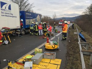 Ein weiteres Fahrzeug war auf dem Dach zum Liegen gekommen und lag vor einen Lastwagen. Trotz des schnellen Einsatz von Rettungsdienst und Feuerwehr, kam für den Fahrer jede Hilfe zu spät, so dass dieser nur noch tot aus seinem Fahrzeug geborgen werden konnte. Der Fahrer des Lkw´s wurde leicht verletzt. Auf dessen Heck, fuhr ein weiterer Lkw frontal auf. Dieser Lkw-Fahrer wurde in seinem Führerhaus eingeklemmt. Ein Großaufgebot des Rettungsdienstes, ein Rettungshubschrauber und drei Notärzte, sowie ein Leitender Notarzt und der organisatorische Leiter des Rettungsdienstes, kamen zum Einsatz. Während die Polizei die Unfallstelle weiträumig absperrte, sicherte die Feuerwehr Weinheim die Einsatzstelle und stellte den Brandschutz sicher. Die Einsatzkräfte der Feuerwehr kümmerten sich mit mehreren Trupps um die verunfallten Fahrzeuge. Eine Löschgruppe leitete mit Unterstützung des Rüstwagens und in Absprache mit dem Notarzt die technische Rettung des eingeklemmten Lkw-Fahrers ein. Parallel zur eigentlichen Rettung kümmerte sich die Wehr um die auslaufenden Flüssigkeiten, fing diese auf und band die Betriebsstoffe mit Ölbindemittel. Während die Besatzung des Rüstwagens, die Gerätschaften für die technische Rettung in Bereitstellung legte, kümmerte sich ein Trupp um den Zugang zum Patient über die Beifahrerseite. Hier wurde eine Rettungsbühne der Feuerwehr am Lkw in Stellung gebracht und mit einem Spreitzer die Tür geöffnet, damit das Rettungsdienstpersonal den Verunfallten besser versorgen konnte.