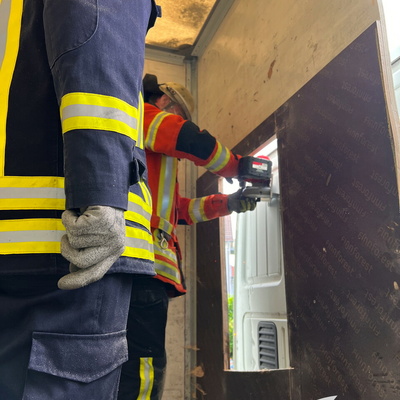 Workshop „LKW-Rettung“ (Frank Bohm, Feuerwehr Ludwigshafen; Thorsten Weber, Feuerwehr Kassel). Bei diesem Workshop konnten die Teilnehmer selbst verschiedene Rettungsgeräte einsetzen, um über die Rückwand der Fahrgastzelle in diese vorzudringen und den „Fahrer“ befreien.
