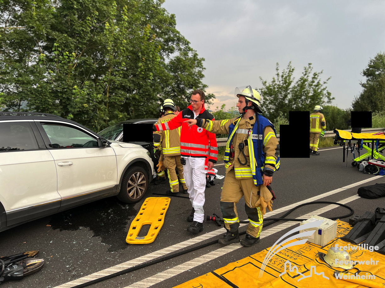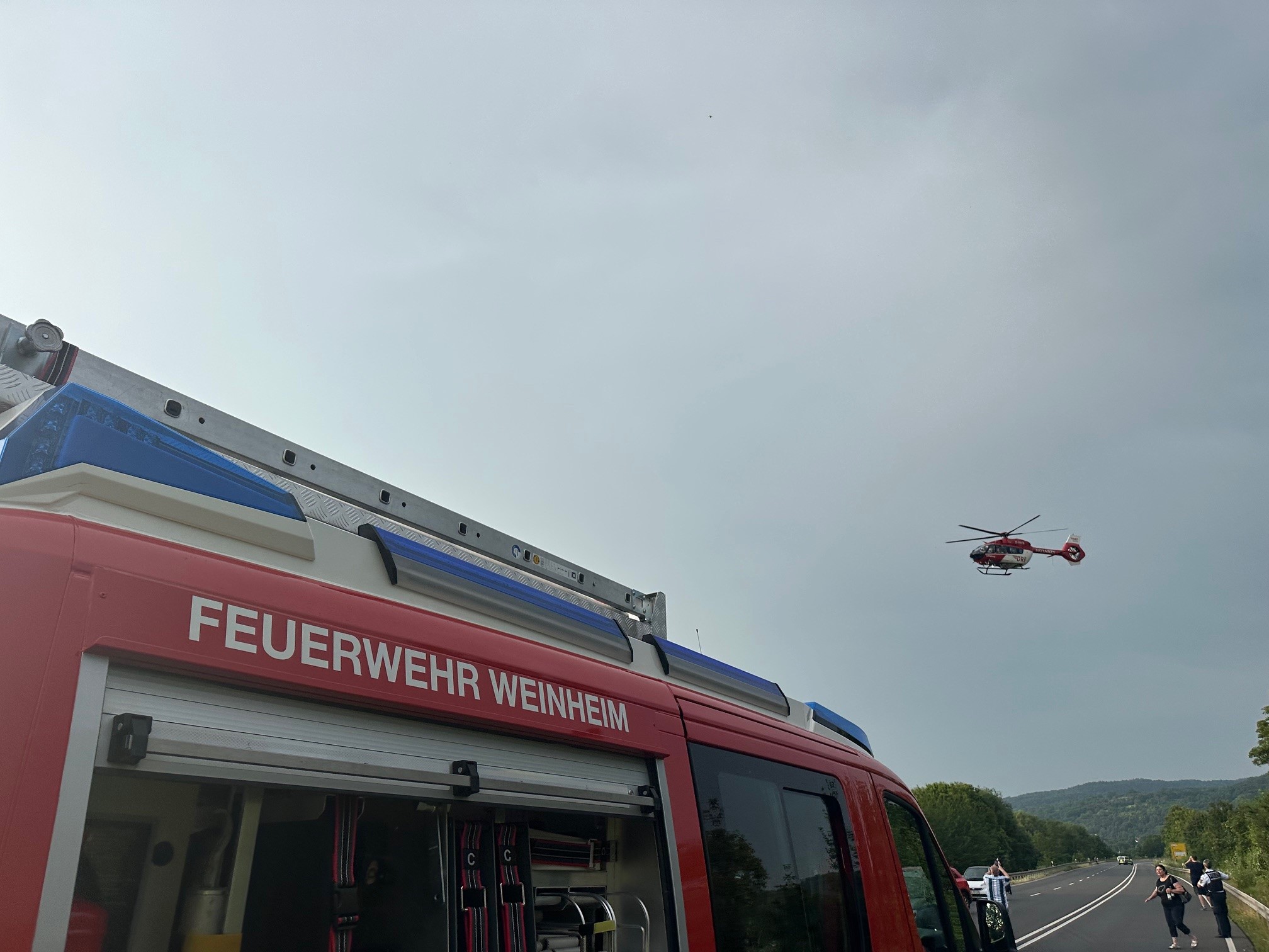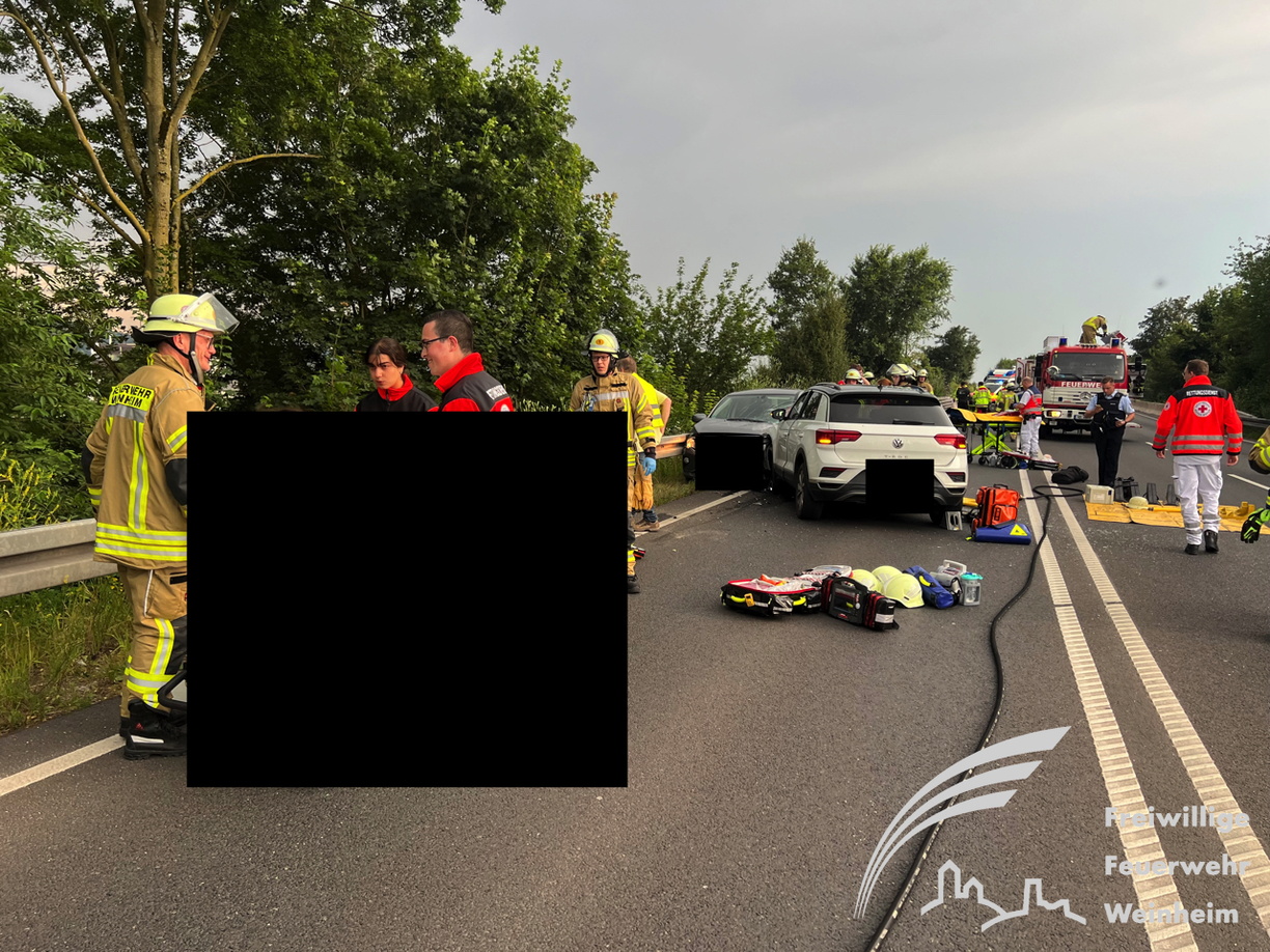 Weinheim. Am Mittwoch um kurz vor 19 Uhr kam es auf der Bundesstraße B38 bei Weinheim auf der Höhe des Industrieparks zu einem Zusammenstoß zweier Autos. Fünf Menschen wurden dabei teilweise schwer verletzt, darunter zwei Kinder. Nach Informationen der Polizei fuhr eine 35 Jahre alte Frau mit ihrem VW T-Roc die B38 Richtung Autobahnkreuz Weinheim entlang. Auf Höhe des Industrieparks kam sie aus bislang ungeklärter Ursache nach links in den Gegenverkehr. Dort stieß sie frontal mit einem Mitsubishi zusammen.