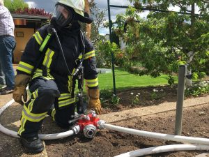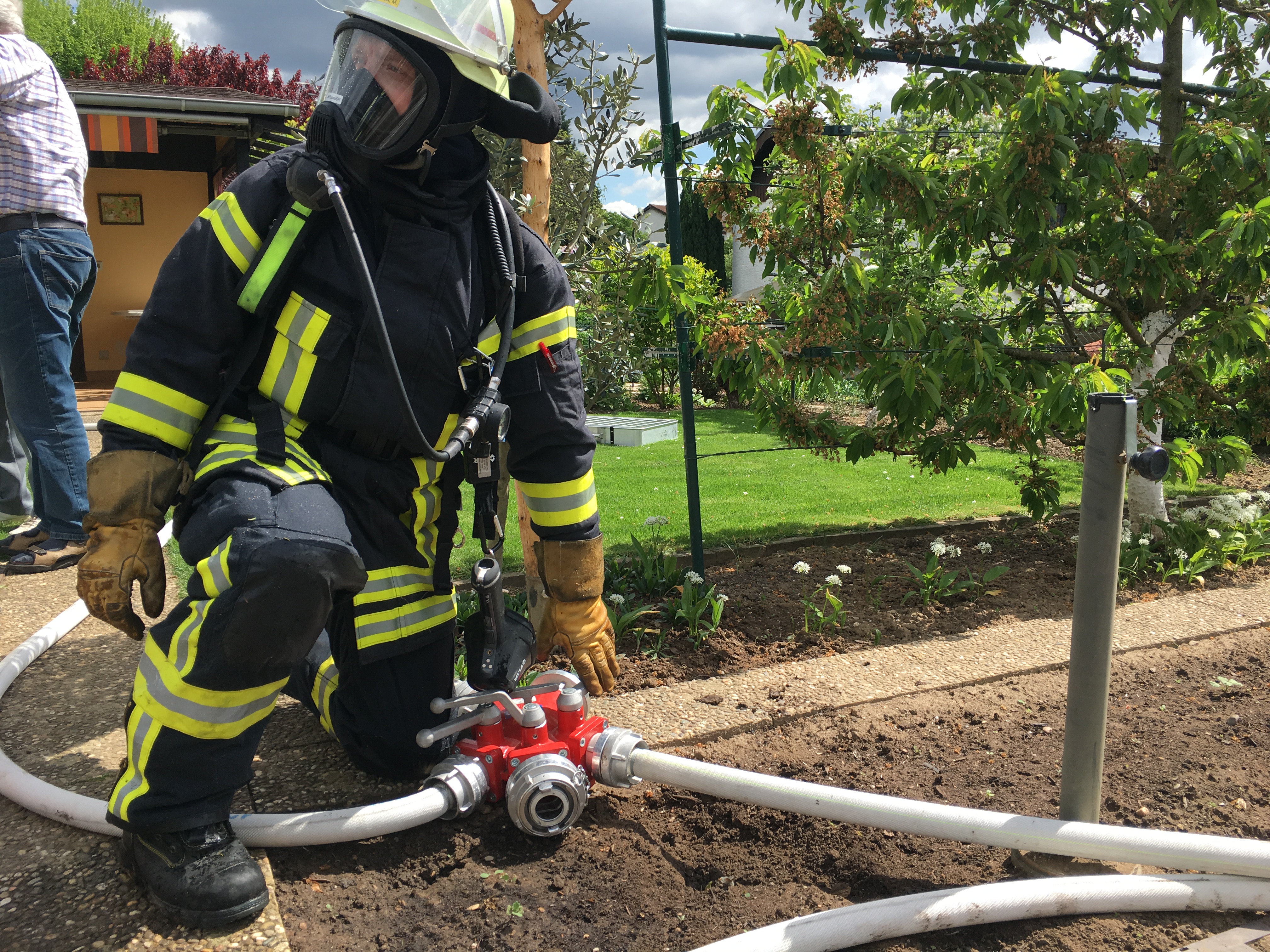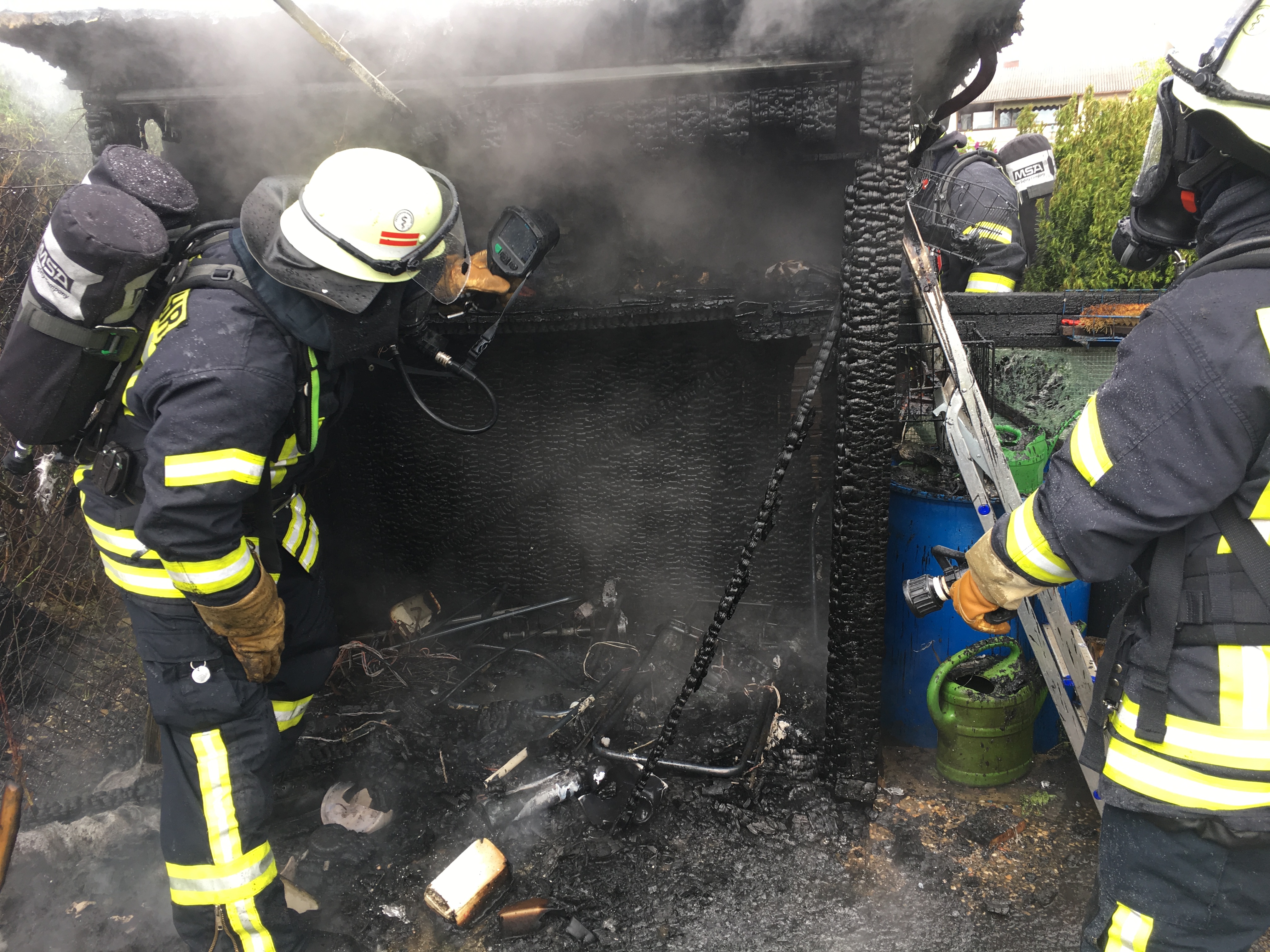 In der Kleingartenanlage Kuhweide geriet am Donnerstagmittag ein Geräteschuppen in Brand und griff auf die angrenzende Hecke sowie den nächsten Geräteschuppen über. Die Freiwillige Feuerwehr Weinheim Abteilung Stadt rückte in die Boschstraße aus. Bereits auf der Anfahrt war die schwarze Rauchsäule weithin sichtbar. Mit sechs Fahrzeugen und 21 Einsatzkräften brachte die Wehr das Feuer schnell unter Kontrolle. Während das Vorauslöschfahrzeug in den kleinen engen Weg der Kleingartenanlage einfahren konnte und einen Löschangriff aufbaute, wurde parallel von außen mit einem weiteren Löschfahrzeug eine Riegelstellung aufgebaut. Dadurch konnte eine weitere Ausbreitung des Feuers verhindert werden. Ein weiteres Löschfahrzeug fuhr vor die Gartenanlage und baute die Wasserversorgung zum Vorauslöschfahrzeug auf. Um ausreichend Löschmittel zur Verfügung zu stellen wurde der Abrollbehälter Löschmittel an die Einsatzstelle gebracht, der die Löschfahrzeuge mit Löschwasser einspeiste. Zwei Trupps unter Atemschutz kümmerten sich auf dem Gelände um den Brand und löschten diesen. Der Geräteschuppen brannte komplett aus und der Brand beschädigte auch den Schuppen des Nachbargrundstücks. Durch das schnelle Eingreifen konnte das Inventar aber vor dem Feuer geschützt werden. Nach einer Stunde und einer abschließenden Brandnachschau mit der Wärmebildkamera konnte die Einsatzstelle der Polizei übergeben werden.