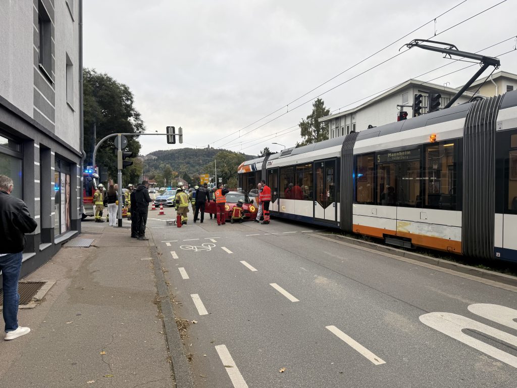 Am Donnerstagmorgen wurde die Feuerwehr Weinheim zu einem Verkehrsunfall zwischen einem PKW und einer Straßenbahn in die Mannheimer Straße alarmiert.