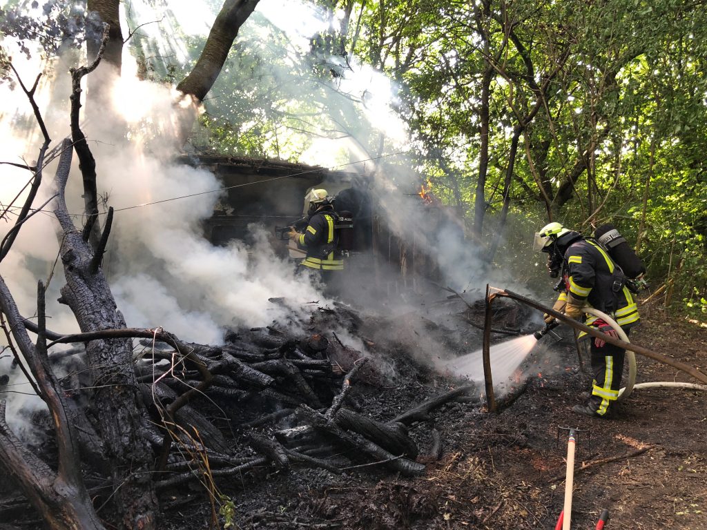 Auf einem Schrebergarten Grundstück neben der Ausfahrt Westtangente Ecke Mannheimer Straße, kam es am frühen Mittwochabend kurz nach 18 Uhr aus bisher unerklärlichen Gründen zu einem Brand. Die Freiwillige Feuerwehr Weinheim Abteilung Stadt fuhr die Einsatzstelle mit einem Löschfahrzeug und dem Abrollbehälter Tank an. Bei Eintreffen der Einsatzkräfte stand ein Wohnwagen und ein Reisighaufen bereits in Brand. Mit zwei Trupps unter Atemschutz und zwei C-Rohren wurden die meterhohen Flammen gelöscht. Das Feuer hatte bereits auf mehrere Bäume übergegriffen und sich. Die Ausbreitung weitere konnten die Einsatzkräfte durch den Löschangriff verhindern. Da unklar war, ob sich im Wohnwagen Personen befinden, wurde dieser im Inneren abgesucht. Hier konnte der eingesetzte Trupp schnell Entwarnung geben. Mit Dunghacken wurde der Reisighaufen auseinandergezogen um an die tiefliegenden Glutnester zu kommen. Nach dem die Nachlöscharbeiten soweit abgeschlossen waren, wurde mit der Wärmebildkamera eine abschließende Brandnachschau durchgeführt. Die Einsatzstelle wurde der Polizei Weinheim zur Brandursachenermittlung übergeben.