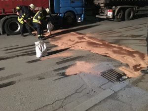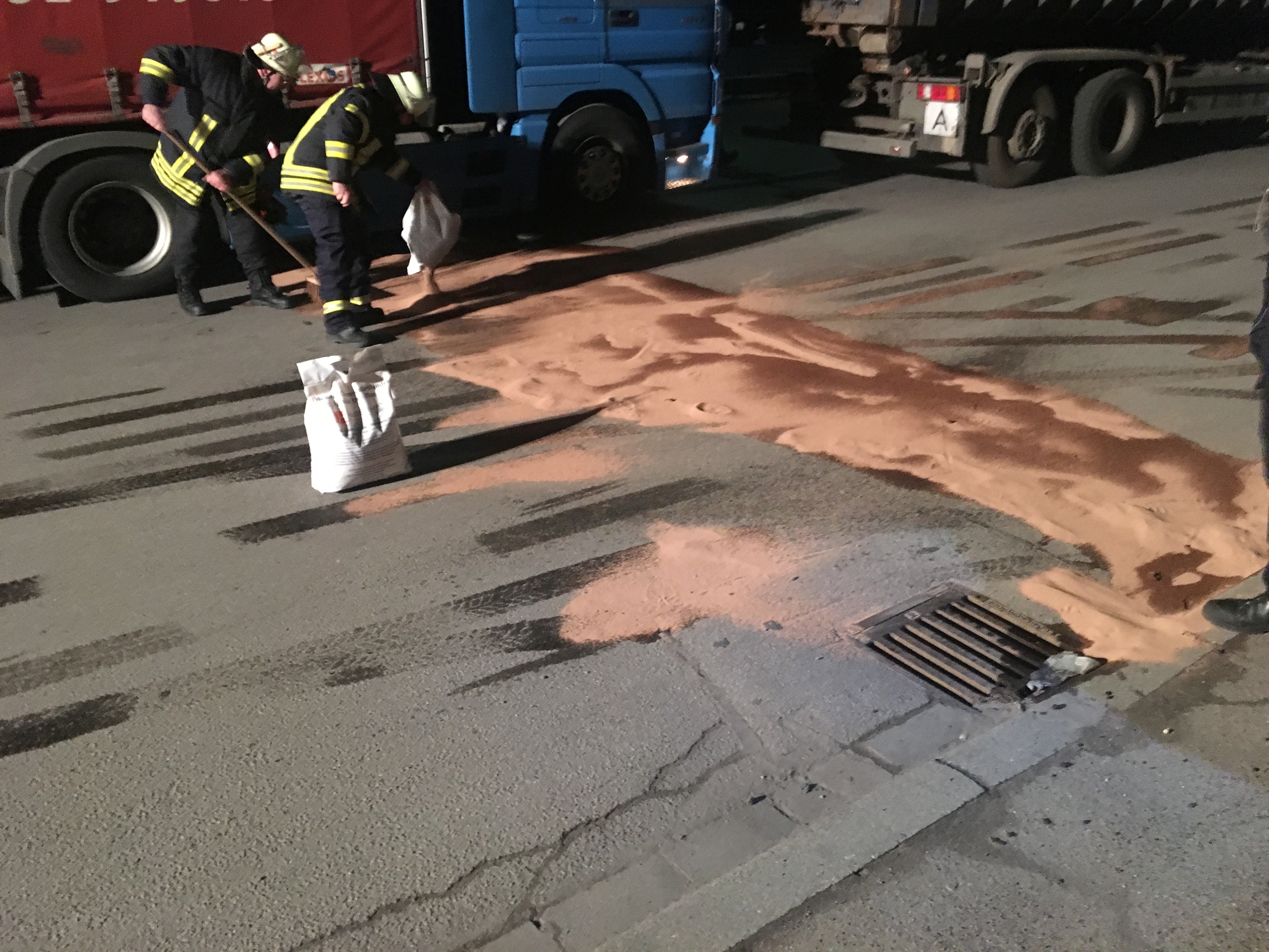 Zur Ruhe kamen die Einsatzkräfte nach dem Einsatz nicht. Kurz nach Mitternacht rückte die Wehr in der Nacht auf Freitag in die Daimlerstraße aus. Hier wurde auslaufender Kraftstoff gemeldet, der sich aus einem Tankdeckel drückte. Die Einsatzkräfte sicherten die Einsatzstelle, stellten den Brandschutz sicher und leuchteten großflächig aus. Parallel dazu wurde sichergestellt, dass sich der Kraftstoff nicht weiter ausbreiten und in die Kanaleinläufe fließen konnte. Der Kraftstoff wurde abgepumpt und die Fahrbahn von einer Fachfirma gereinigt. Nach zwei Stunden konnte der Einsatz beendet und die Fahrbahn von der Polizei wieder freigegeben werden.