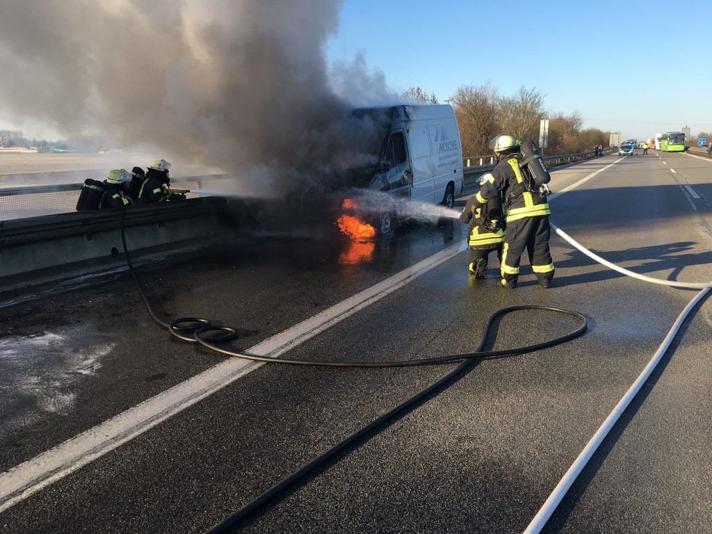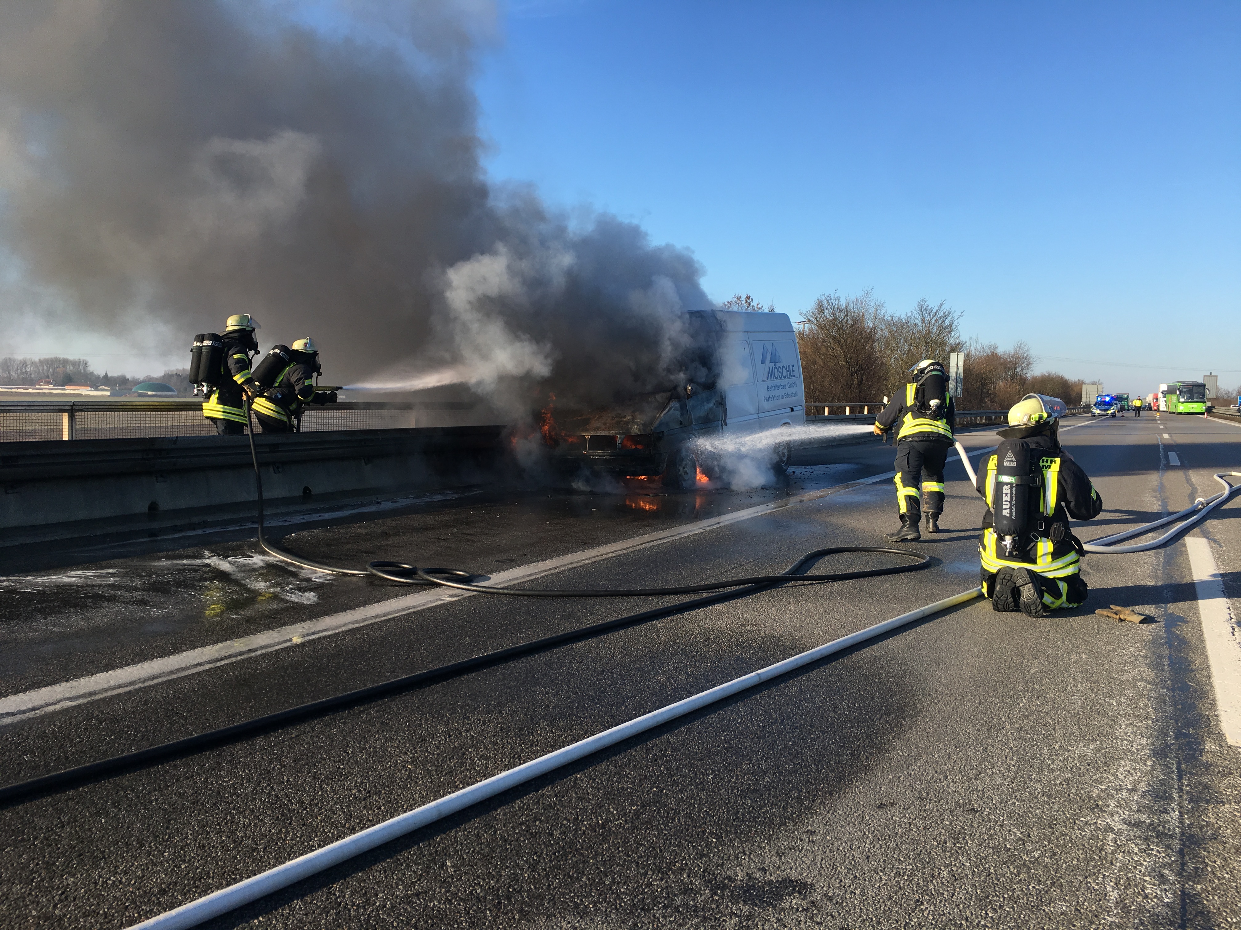 Die Einsatzkräfte sicherten die Einsatzstelle und gingen mit zwei Trupps und zwei Rohren unter Atemschutz zum brennenden Fahrzeug vor. Die Wasserversorgung wurde durch drei weitere Löschfahrzeuge sichergestellt, die insgesamt 5300 Liter Löschwasser auf die Autobahn zur Brandbekämpfung brachten. Der Gerätewagen Licht mit der Verkehrsabsicherungseinrichtung wurde in Stellung gebracht und unterstützte die Absicherungsmaßnahmen. Nach 20 Minuten hatte die Feuerwehr den Brand soweit unter Kontrolle, das eine Fahrspur wieder freigegeben werden konnte. Es stellte sich heraus, dass es sich um ein Fahrzeug eines Handwerksbetriebs handelte, der eine Gasflasche transportiert hatte. Diese wurde gekühlt und konnte aus dem Gefahrenbereich gebracht werden. Nachdem das Fahrzeug gelöscht war, wurde eine abschließende Brandnachschau mit der Wärmebildkamera gehalten um gegebenenfalls Glutnester zu finden und zu löschen. Die Autobahnmeisterei kümmerte sich mit Streusalz um das Löschwasser auf der Fahrbahn, damit dieses nicht gefrieren konnte. Gegen 16 Uhr konnte der Einsatz beendet werden.