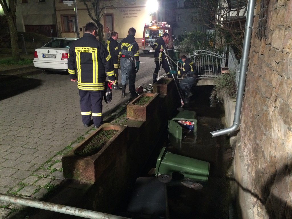 Die Polizei Weinheim hatte die Feuerwehr angefordert, nachdem Anwohner festgestellt hatten, dass mehrere Mülltonnen in die Gerberbach geworfen wurden. Zuvor hatten Anwohner ein paar junge Personen in dem Viertel gesehen, die lautstark durch das Gerberbachviertel zogen. Das kleine Bächlein staute sich stark da die Mülltonnen samt Müll sich unter den Übergängen durch den Wasserdruck festkeilten. Die Feuerwehrangehörigen hatten schwer zu tun die mit Papier gefüllten und Wasser vollgelaufenen Mülltonnen heraus zuholen. Der städtische Bauhof wurde von der Feuerwehr zur Unterstützung angefordert um das Wasser der Gerberbach