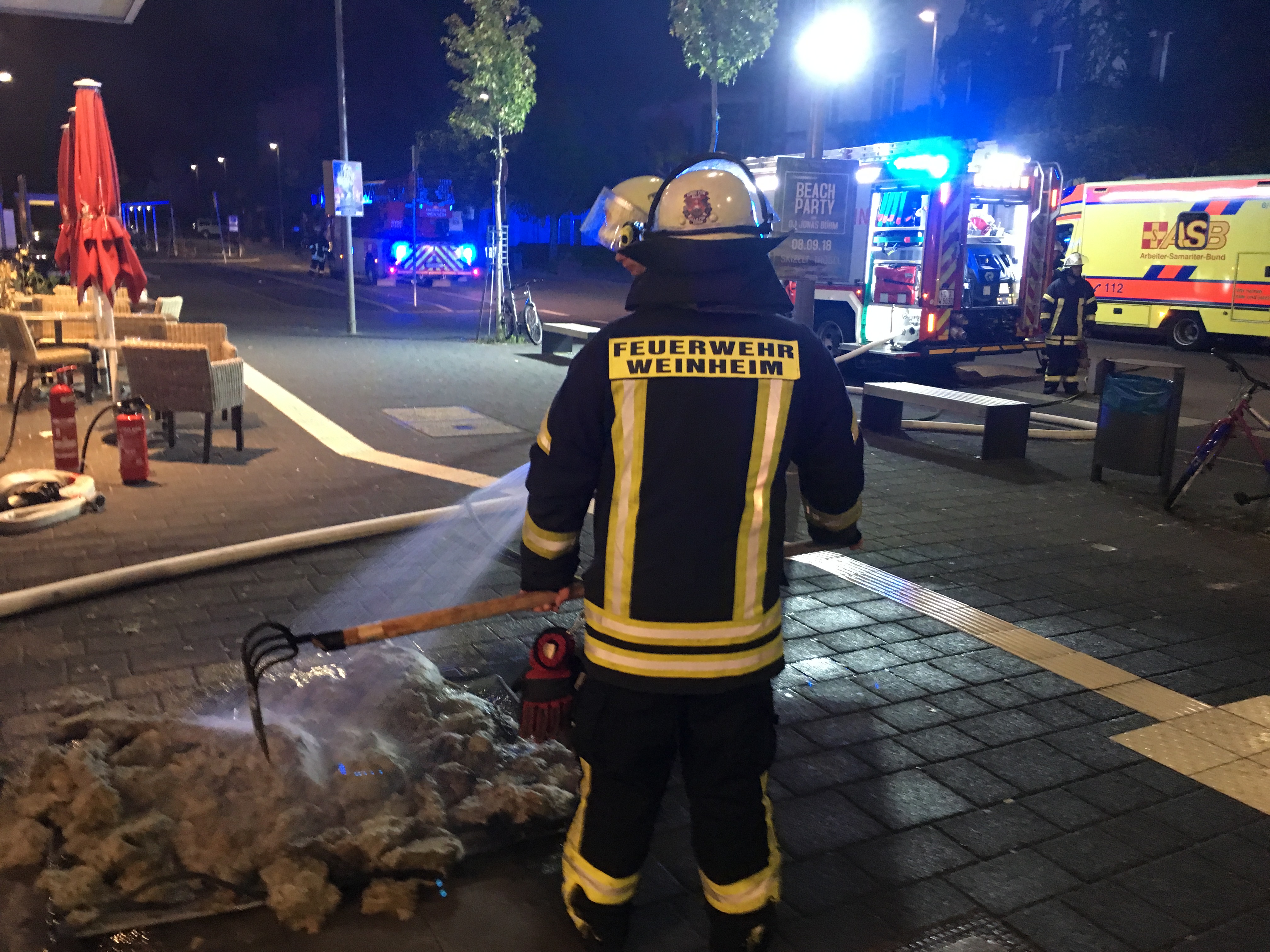 Nachdem die Freiwillige Feuerwehr Weinheim gerade von der Überlandhilfe eines ausdehnten Gebäudebrands im Gorxheimertal eingerückt war, wurden die ehrenamtlichen Kräfte erneut zur Hilfe gerufen. Diesmal war es in einer Bäckerei im Weinheimer Hauptbahnhof zu einem Brand gekommen. Ein Backofen war gegen 5:30 Uhr aus bisher unbekannter Ursache in Brand geraten. Die Mitarbeiter konnten sich rechtzeitig in Sicherheit bringen, während Beamte des Polizeireviers erste Löschversuche mit Feuerlöschern unternahmen. Aufgrund der starken