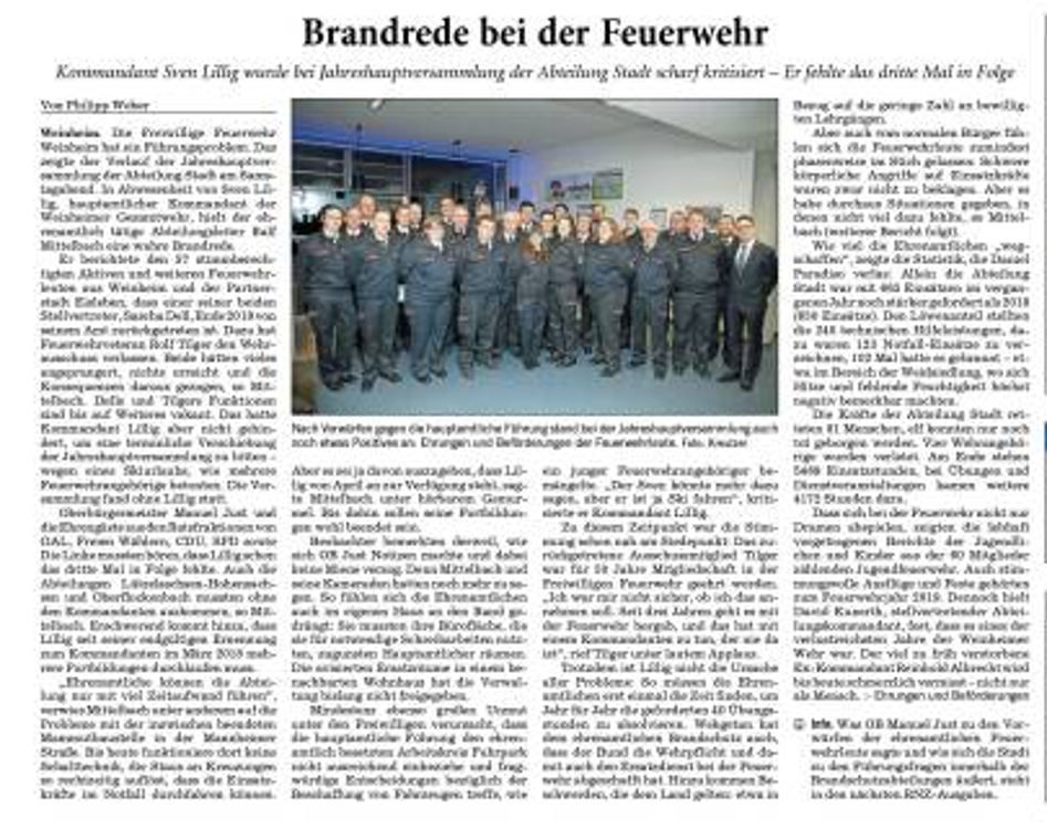 Er berichtete den 57 stimmberechtigten Aktiven und weiteren Feuerwehrleuten aus Weinheim und der Partnerstadt Eisleben, dass einer seiner beiden Stellvertreter, Sascha Dell, Ende 2019 von seinem Amt zurückgetreten ist. Dazu hat Feuerwehrveteran Rolf Tilger den Wehrausschuss verlassen. Beide hätten vieles angeprangert, nichts erreicht und die Konsequenzen daraus gezogen, so Mittelbach. Dells und Tilgers Funktionen sind bis auf Weiteres vakant. Das hatte Kommandant Lillig aber nicht gehindert, um eine terminliche Verschiebung der Jahreshauptversammlung zu bitten – wegen eines Skiurlaubs, wie mehrere Feuerwehrangehörige betonten. Die Versammlung fand ohne Lillig statt.