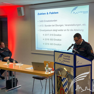 Als Schriftführer des Feuerwehrausschusses lieferte Daniel Paradiso den Rechenschaftsbericht. Zum 31. Dezember 2019 gehörten der Freiwilligen Feuerwehr der Stadt Weinheim (Abteilung Stadt) insgesamt 184 Kameradinnen und Kameraden an – im Einzelnen 92 aktive Mitglieder der Einsatzabteilung, 60 Mitglieder der Kinder- sowie Jugendfeuerwehr und 33 Mitglieder der Alters- und Ehrenmannschaft. Das Durchschnittsalter der Abteilung Stadt beläuft sich auf 34,5 Jahre. Im Jahr 2019 bewältigten die Aktiven 665 Einsätze (245 technische Hilfeleistungen, 102 Brandeinsätze, 131 Fehleinsätze, 19 sonstige Einsätze, 45 Psychosoziale Notfallversorgung, 123 Helfer vor Ort-Einsätze). Im Vorjahr lag die Zahl mit 650 Einsätzen etwas darunter. „Bei den Einsätzen konnten 81 Personen gerettet und elf Personen konnten nur noch tot geborgen werden. Vier Feuerwehrangehörige wurden verletzt“, sagte Paradiso. Die geleisteten Einsatzstunden beliefen sich auf 5.469 Stunden. Hinzu kamen 4.172 Stunden bei Übungen und Dienstveranstaltungen, aber auch viele Sondertermine und Objektbegehungen schlugen nochmals mit 9.641 Stunden zu Buche.