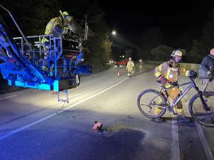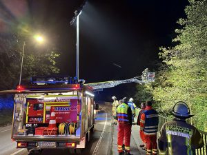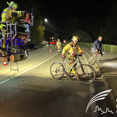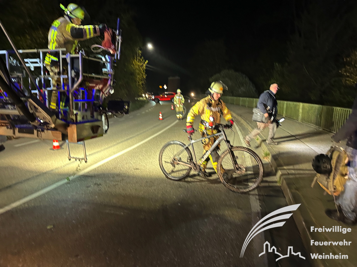 Durch die Dunkelheit und die nassen Kleider kamen sie dann in die hilflose Lage. Für die Rettung der Kinder musste die Birkenauer Talstraße komplett gesperrt werden. Mit dem Gerätewagen Licht wurde zunächst die Einsatzstelle großflächig ausgeleuchtet. Im Anschluss brachte die Feuerwehr die Drehleiter in Stellung und fuhr mit dem Leiterpark auf die andere Uferseite. Zwei Feuerwehrmänner nahmen die Kinder in Empfang, sicherten Sie und fuhren Sie mit dem Korb der Drehleiter auf die Straßenseite. Dort wurden Sie vom Rettungsdienst in Empfang genommen und gesichtet. Ausser einem Schreck, blieben Sie glücklicherweise unverletzt. Mit der Drehleiter wurden dann auch noch die Fahrräder geborgen.