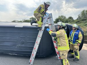 Weinheim.Gegen 10:20 Uhr wurde die Weinheimer Feuerwehr auf die Bundesautobahn 659 zu einem Verkehrsunfall gerufen. Aus bisher ungeklärter Ursache kam der Fahrer eines Mercedes Sprinter in Höhe der Autobahntankstelle von der Fahrbahn ab, fuhr in den Seitenstreifen, kam wieder auf die Fahrbahn und kippte auf die Seite um. Der Fahrer konnte sich selbstständig befreien und wurde von einer zufällig vorbeikommenden Besatzung eines Krankentransportwagens erstversorgt. Der Fahrer wurde leicht verletzt und nach der weiteren medizinischen Behandlung, durch den Notarzt mit einem Rettungswagen zur weiteren Behandlung in ein Krankenhaus gebracht. Durch den umgekippten Sprinter war die Fahrbahn blockiert, sodass die Autobahn zwischen dem Weinheimer Kreuz und der Anschlussstelle Viernheim Ost voll gesperrt werden musste. Die Feuerwehr unterstützte die Polizei bei der Straßensperrung. Am Weinheimer Kreuz wurde daher der Verkehr auf die A5 umgeleitet. Die Fahrzeuge die zwischen dem Autobahnkreuz und der Unfallstelle standen, wurden von der Polizei aufgefordert, zu drehen und wurden ebenfalls über die Autobahn 5 umgeleitet. Parallel dazu stellte die Feuerwehr den Brandschutz sicher und kümmerte sich um die auslaufenden Flüssigkeiten.