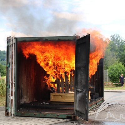 Am frühen Nachmittag dann verlagerte sich das Hauptgeschehen an den Kreisverkehrsplatz. Dort stand bereits ein Container, in dem ein Brandereignis nachgestellt wurde. Einen Moment nicht aufgepasst oder unaufmerksam gewesen – schon löst die Zigarettenkippe oder die unbeaufsichtigte Kerze ein Feuer aus. Dieses breitete sich rasend schnell aus und in noch nicht einmal zwei Minuten stand der komplette „Raum“ vollständig in Flammen. Durch die Einsatzabteilung, unter der Leitung von Gruppenführer Alexander Pun, wurde der Brand rasch und besonnen unter Kontrolle gebracht. Der Angriffstrupp unter schwerem Atemschutz bahnte sich seinen Weg zum Brandherd. Die Besucher wurden in diesem Zusammenhang auf die Rauchmelderpflicht hingewiesen, denn die kleinen Geräte retten Leben. Meist sind es nicht die Flammen, die zur Gefahr werden, sondern der extrem giftige Rauch, der schon nach wenigen Atemzügen zur Bewusstlosigkeit führen kann. Beim Tag der offenen Tür schauten auch einige Feuerwehren aus der Umgebung vorbei, auch Technisches Hilfswerk, Rettungsdienste und Polizei statteten den Kollegen einen Besuch ab. Anwesend waren zudem die Werkfeuerwehr Freudenberg und zwei Oldtimer-Fahrzeuge der Feuerwehr Weinheim.