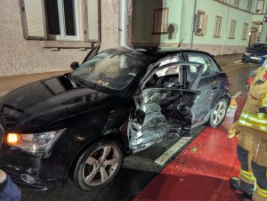 Gegen 20.15 Uhr prallte ein Fahrzeug aus bislang unbekannter Ursache im Bereich der Kreuzung Händelstraße mit einer Straßenbahn der OEG zusammen. Beim Eintreffen der Feuerwehr stand die Straßenbahn auf dem Gleis. Das Unfallfahrzeug war auf der Fahrerseite stark beschädigt.
