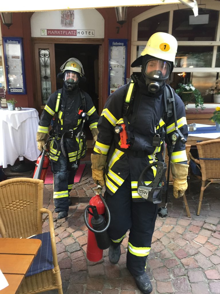 Kurz nach 8 Uhr meldet die Leitstelle Rhein Neckar einen Elektroanlagenbrand in einem Hotel mit Gastronomiebetrieb am Weinheimer Marktplatz. Die Freiwillige Feuerwehr Weinheim Abteilung Stadt rückte mit dem erweiterten Löschzug (drei Löschfahrzeuge, Drehleiter und Einsatzleitwagen) mit 25 Einsatzkräften zur Einsatzstelle aus. Vor Ort stellte sich heraus, dass eine Waschmaschine in Brand geraten war und bereits durch einen Gast mit einem Feuerlöscher gelöscht wurde. Die meisten Gäste und das Personal hatten sich bereits selbstständig in Sicherheit bringen können. Da sich im ersten Obergeschoss noch Personen befanden, wurden diese durch Einsatzkräfte betreut, bis das betroffenen Erdgeschoss vom Rauch mit einem elektrobetriebenen Lüfter befreit war. Die ausgebrannte Waschmaschine wurde ins Freie gebracht und ein Trupp unter Atemschutz kontrollierte die Einsatzstelle mit Kohlendioxidfeuerlöschern. Zwei Mitarbeiter und ein Gast mussten mit Verdacht einer Rauchvergiftung durch den anwesenden Rettungsdienst erstersorgt werden. Zur weiteren Behandlung wurde ein Verletzter ins Krankenhaus gebracht. Nach einer abschließenden Brandnachschau mit der Wärmebildkamera konnte der Einsatz nach einer Stunde beendet werden. Die Polizei Weinheim hat die Ermittlungen zur Brandursache aufgenommen. Probleme gab es bei der Anfahrt, da im Bereich der Feuerwehrzufahrt für die Hauptstraße an der Polleranlage Dürreplatz Fahrzeuge parkten.