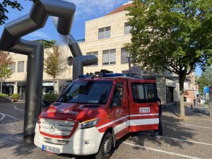 Also ging es zunächst zurück ins Feuerwehrzentrum, wo ein spezielles Rettungsgerät zusammengebaut wurde, um die Igel-Rettung durchführen zu können. Die Einsatzkräfte bauten sich eine 3 Meter lange Lanze und installierten daran ein Fangnetz. Damit ging es dann wieder zurück ins Karlsberg Carré, wo der Igel geduldig auf seine Rettung wartete. Mit viel Geduld und dem nötigen Fingerspitzengefühl gelang es den Brandschützern den Igel aus seiner misslichen Lage zu befreien.