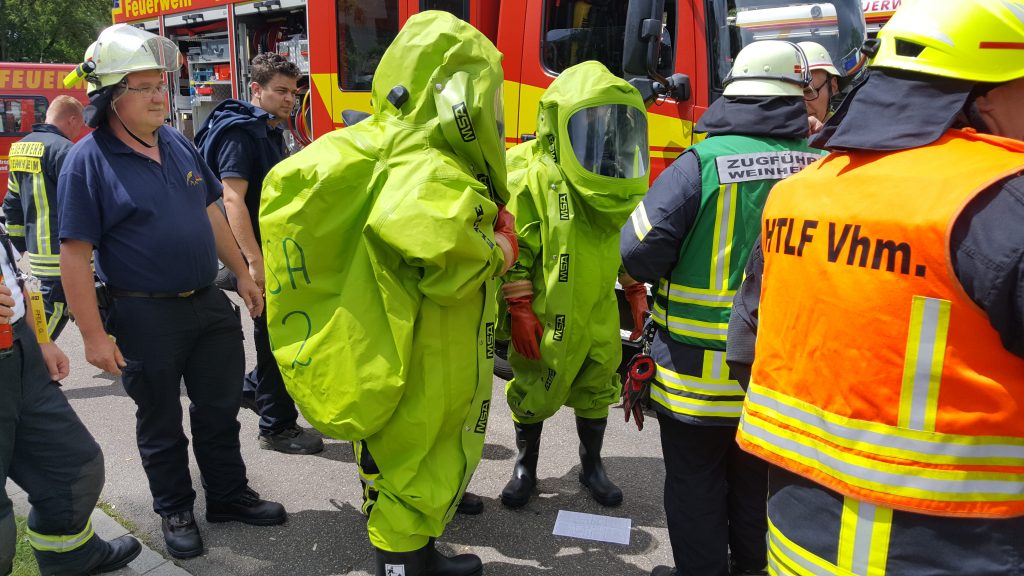 Gestern Überlandhilfe in Viernheim – In Schutzanzügen gegen ätzende Chemikalien – Freiwillige Feuerwehr mit ABC-Ausbildung.