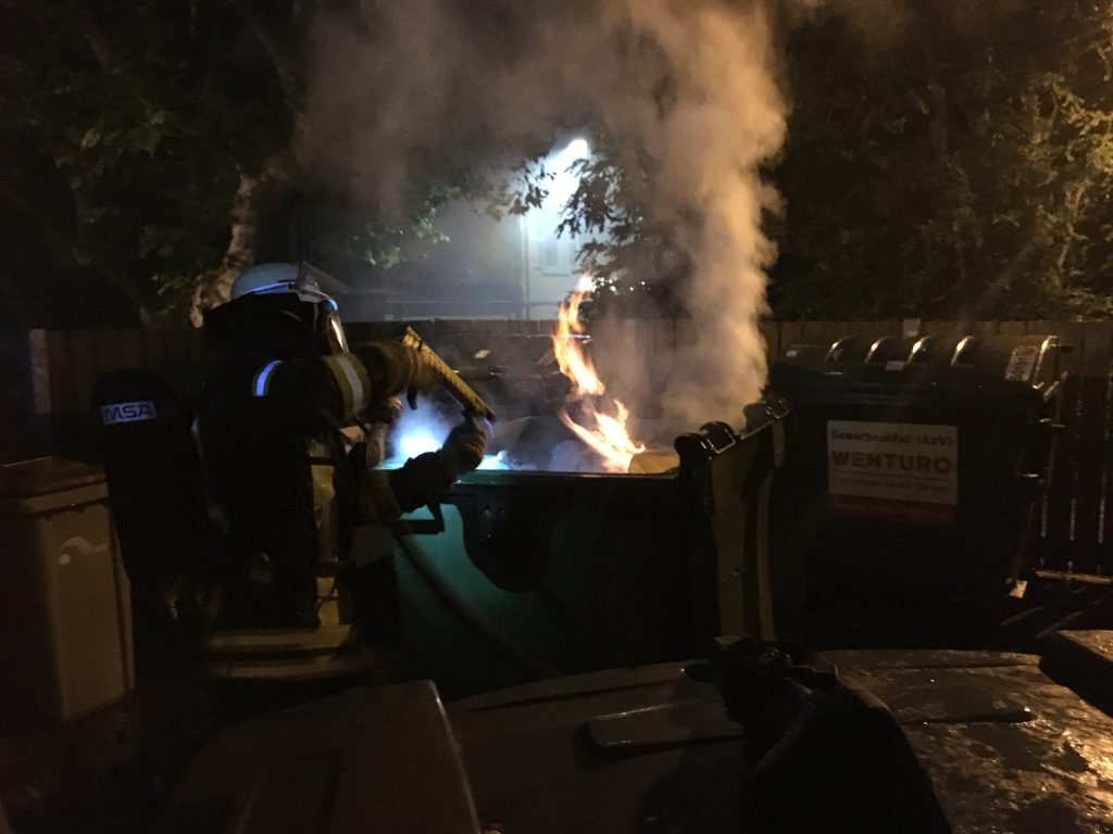 In der Nacht auf Sonntag wurde die Wehr in die Obertorstraße gerufen. Am Weinheimer Rathaus waren aus bisher unbekannter Ursache Müllcontainer in Brand geraten. Die Feuerwehr löschte den Kleinbrand mit einem Rohr unter Atemschutz.